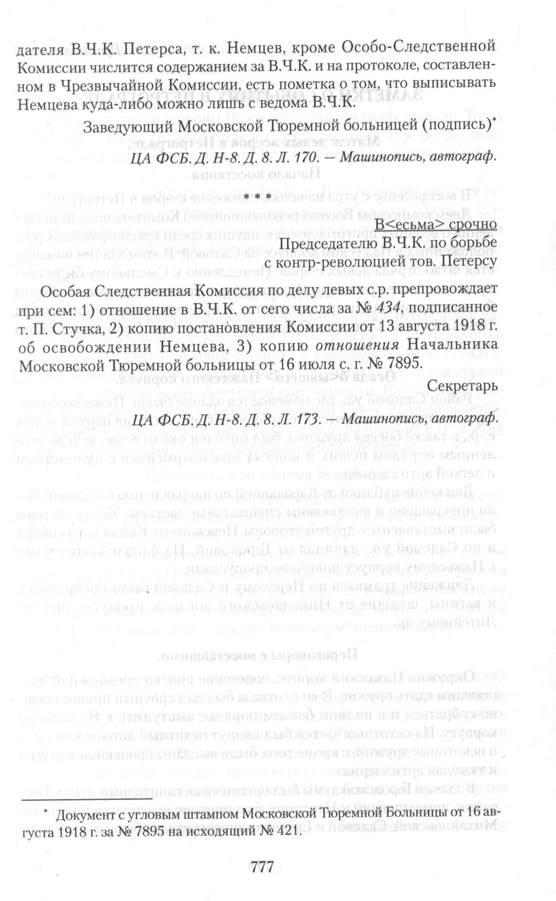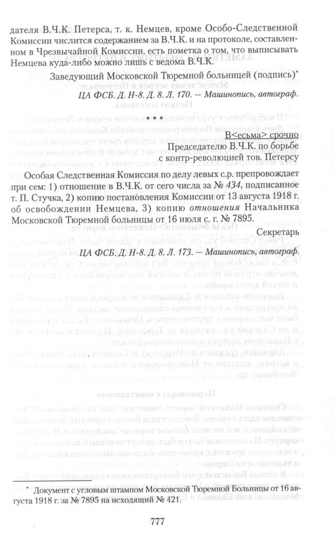 Приложение IV. Материалы на Владимира Немцова. Председателю В.Ч.К. по борьбе с контрреволюцией тов. Петерсу // ЦА ФСБ.Д. Н-8.Д. 8. Л. 173. — Машинопись, автограф.