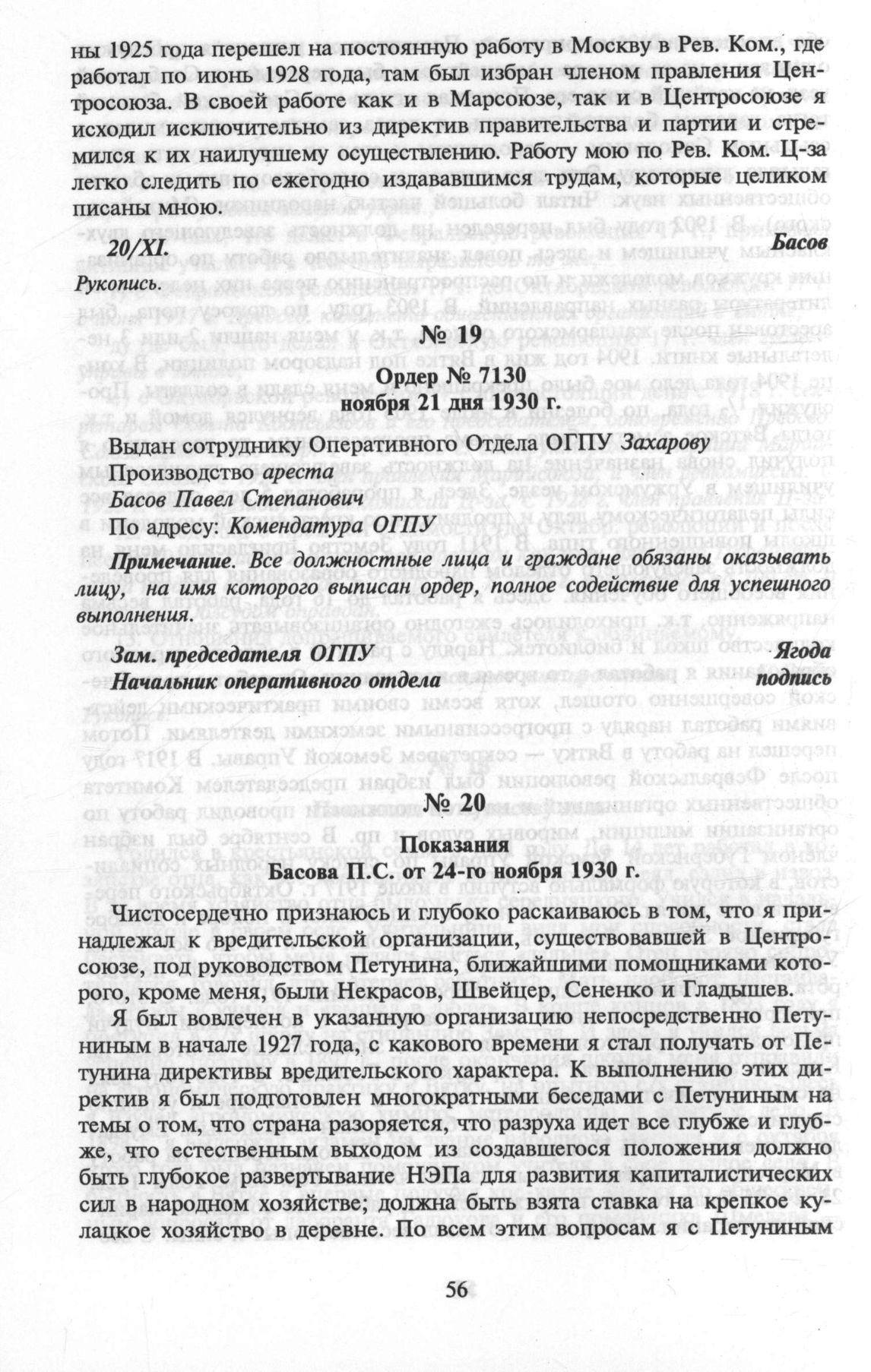 Басов Павел Степанович. Ордер № 7130 ноября 21 дня 1930 г. // ЦА ФСБ РФ.