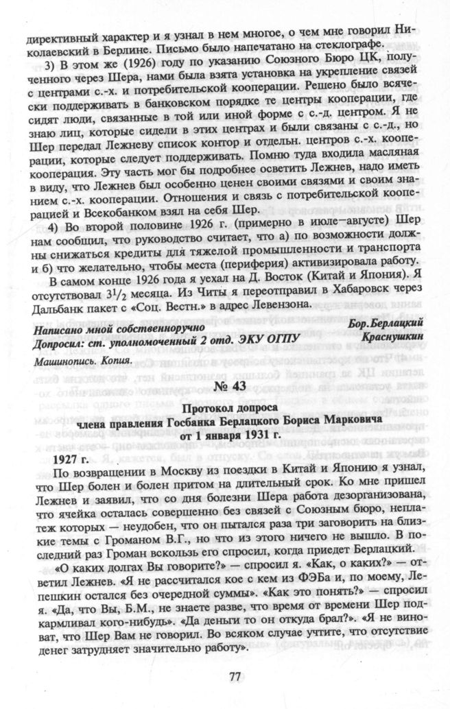Берлацкий Борис Маркович. Протокол допроса члена правления Госбанка Берлацкого Бориса Марковича от 1 января 1931 г. // ЦА ФСБ РФ. Машинопись. Копия.