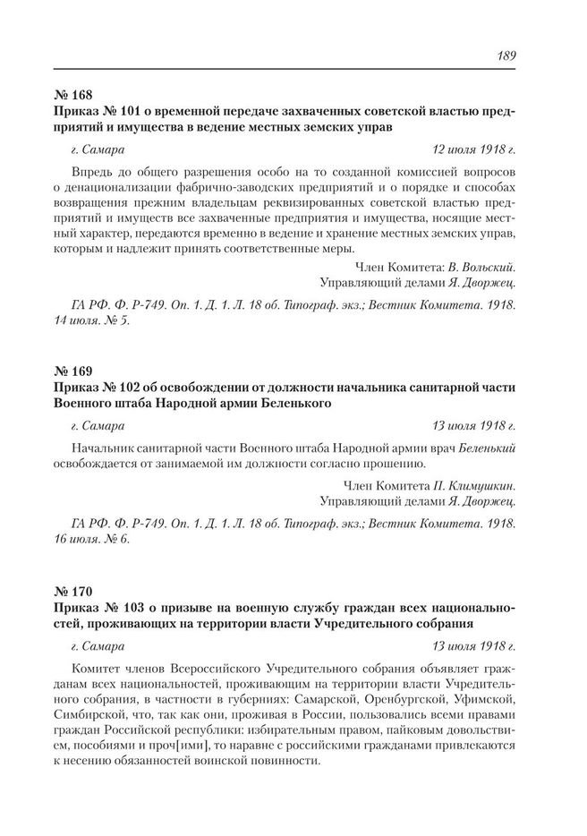 Приказ Комитета членов Всероссийского Учредительного собрания № 103 о призыве на военную службу граждан всех национальностей, проживающих на территории власти Учредительного собрания. 9 июля 1918 г. // ГА РФ. Ф. Р-749. Оп. 1. Д. 1. Л. 19. Типограф. экз.; Вестник Комитета. 1918. 16 июля. № 6.