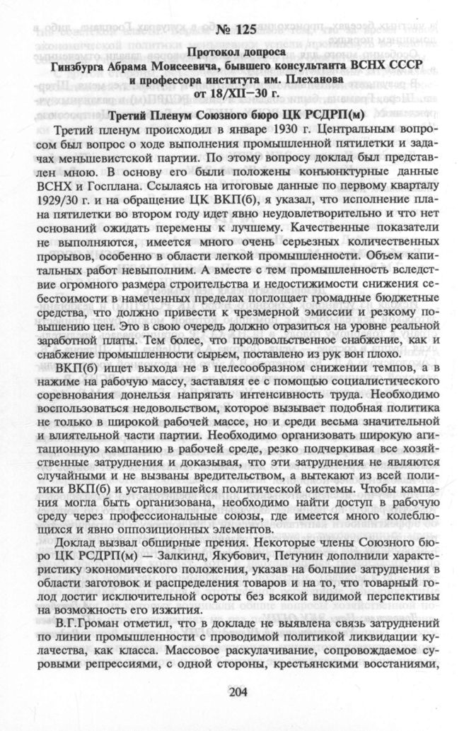 Гинзбург Абрам Моисеевич. Протокол допроса Гинзбурга Абрама Моисеевича, бывшего консультанта ВСНХ СССР и профессора института им. Плеханова от 18/ХII—1930 г. // ЦА ФСБ РФ. Машинопись. Копия.