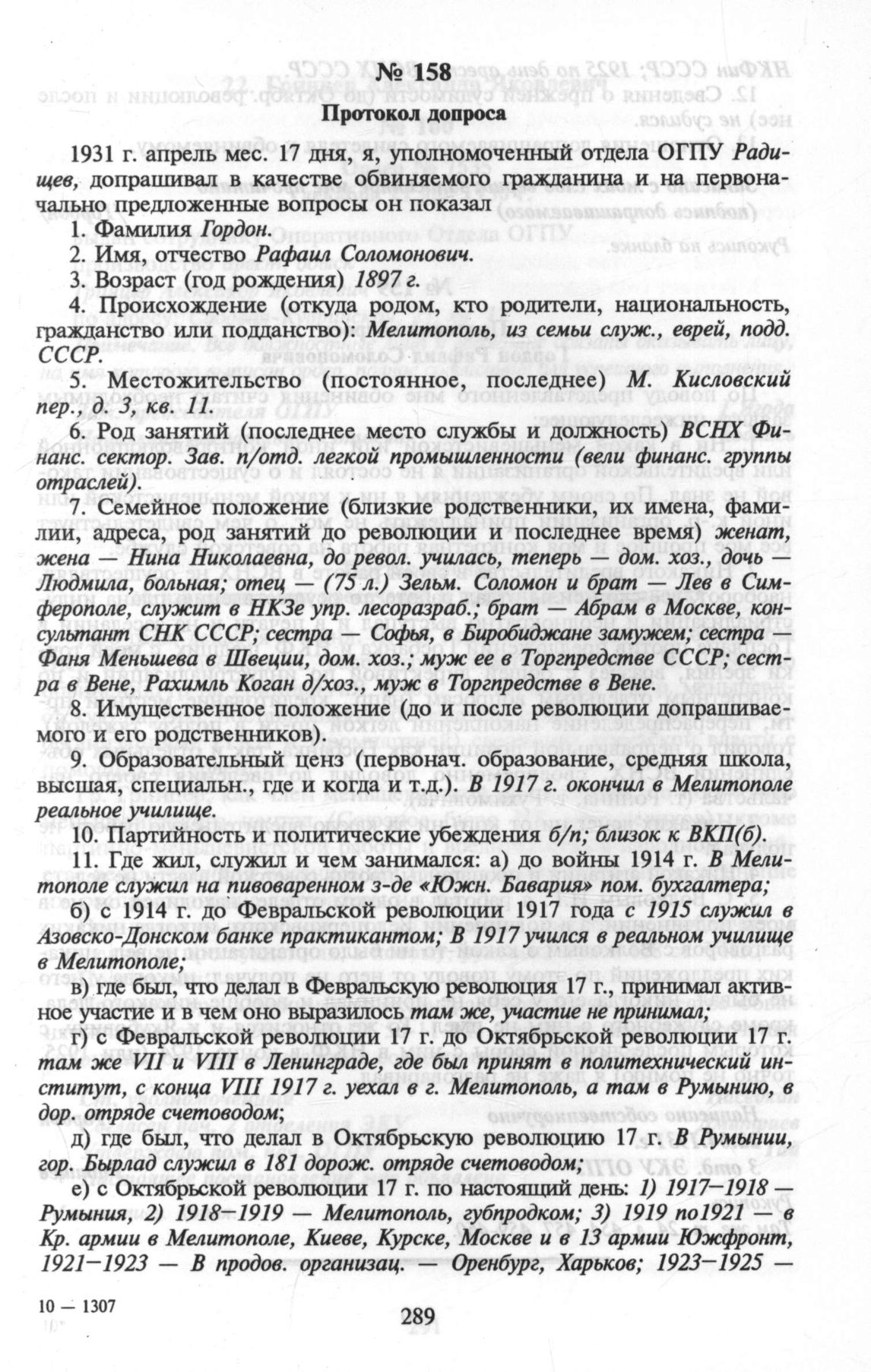 Гордон Рафаил Соломонович. Протокол допроса // ЦА ФСБ РФ. Рукопись на бланке.