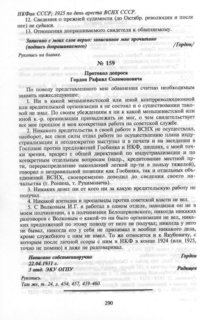 Главная Серия «Политические партии России. Конец XIX – первая треть ХХ века... Меньшевики в 1903—1931 гг. Меньшевистский процесс 1931 года. Сборник документов. В 2-х кн. Кн. 1 Документы Гордон Рафаил Соломонович. Протокол допроса Гордон Рафаил Соломоновича