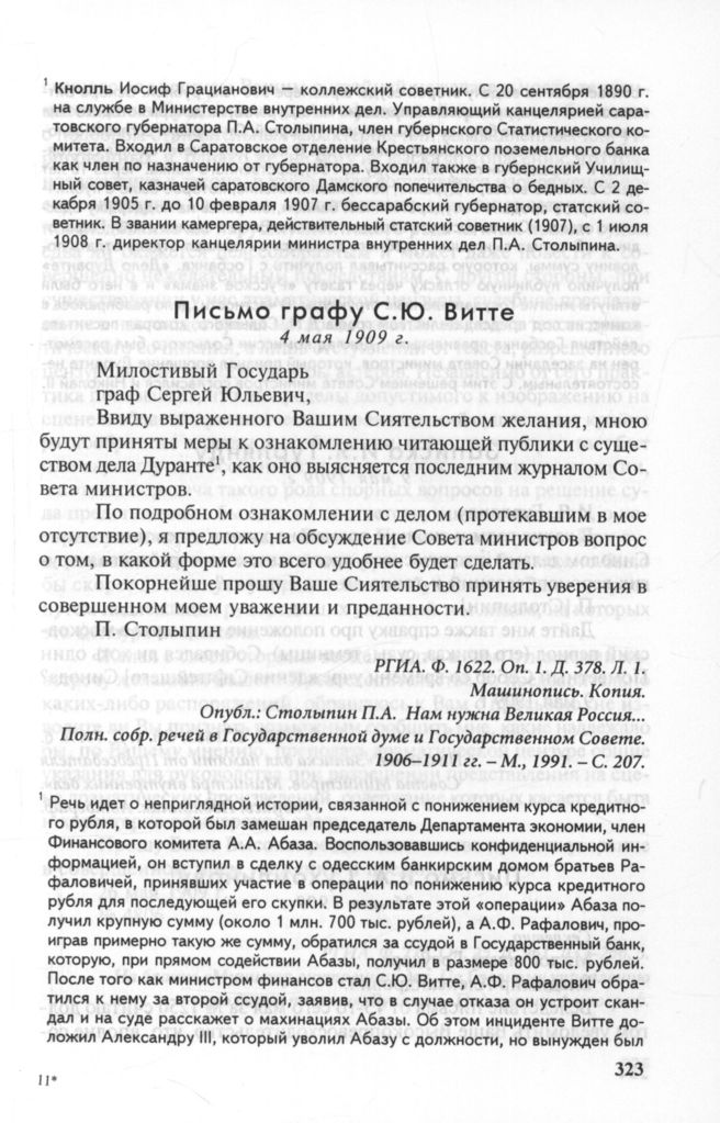 Письмо графу С.Ю. Витте, 4 мая 1909 г. // РГИА. Ф. 1622. Оп. 1. Д. 378. Л. 1. Машинопись. Копия. Опубл.: Столыпин П.А. Нам нужна Великая Россия... Полн. собр. речей в Государственной думе и Государственном Совете. 1906-1911 гг. - М., 1991. - С. 207.