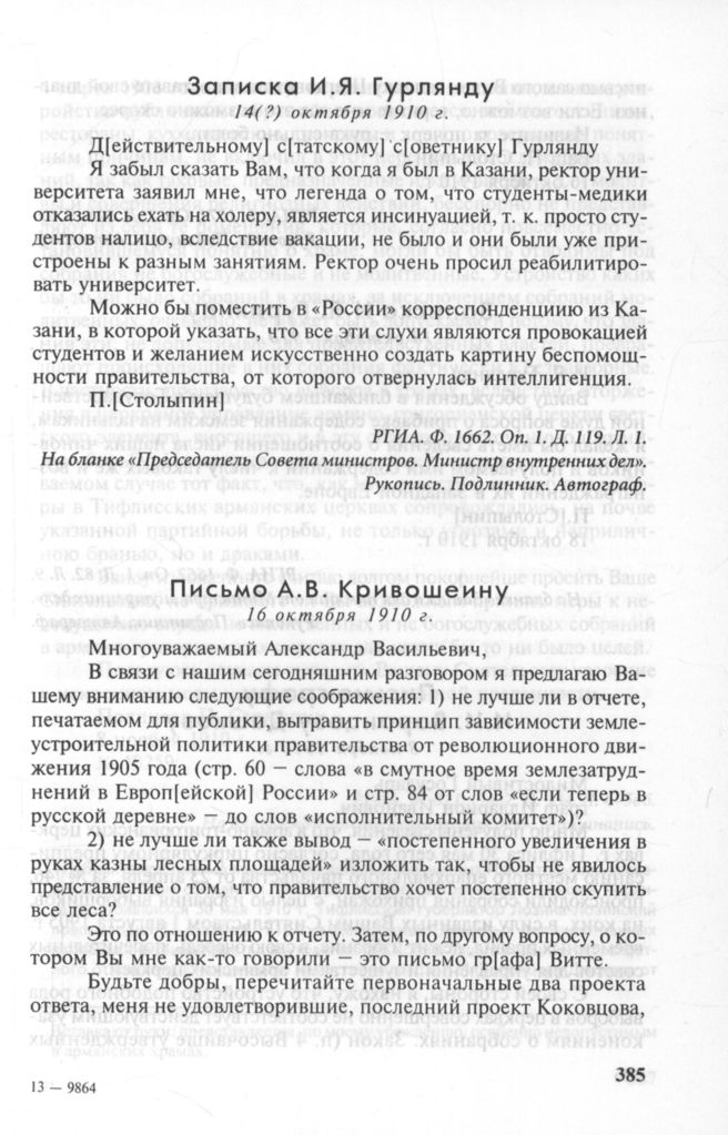 Записка И.Я. Гурлянду, 14(?) октября 1910 г. // РГИА. Ф. 1662. Оп. 1. Д. 119. Л. 1. На бланке «Председатель Совета министров. Министр внутренних дел». Рукопись. Подлинник. Автограф.