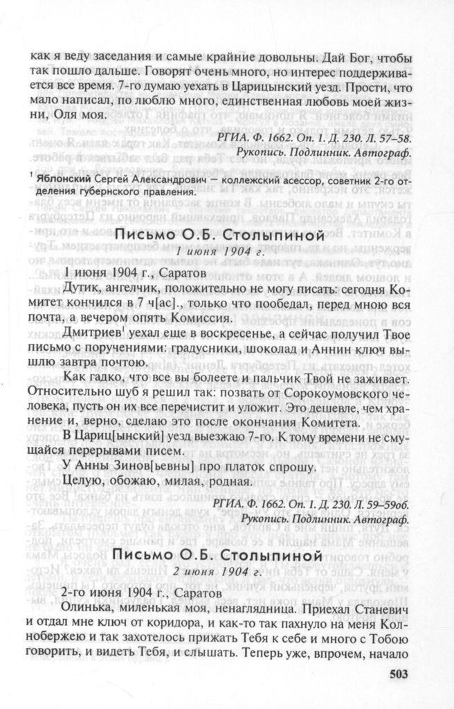 Письмо О.Б. Столыпиной, 1 июня 1904 г. // РГИА. Ф. 1662. Оп. 1. Д. 230. Л. 59-59об. Рукопись. Подлинник. Автограф.
