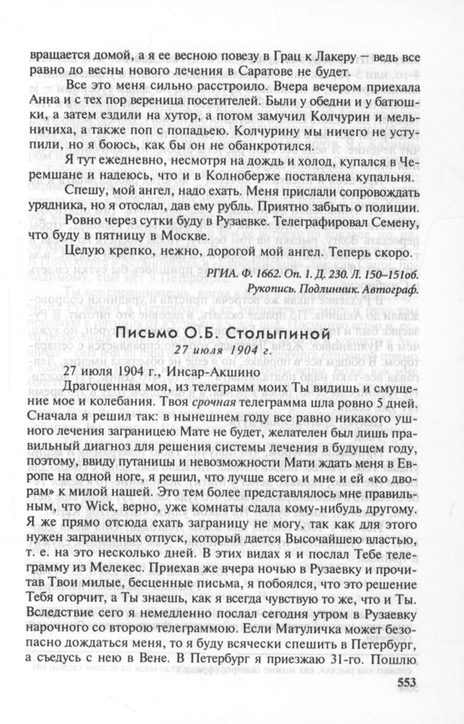 Письмо О.Б. Столыпиной, 27 июля 1904 г. // РГИА. Ф. 1662. Оп. 1. Д. 230. Л. 153-154об. Рукопись. Подлинник. Автограф.
