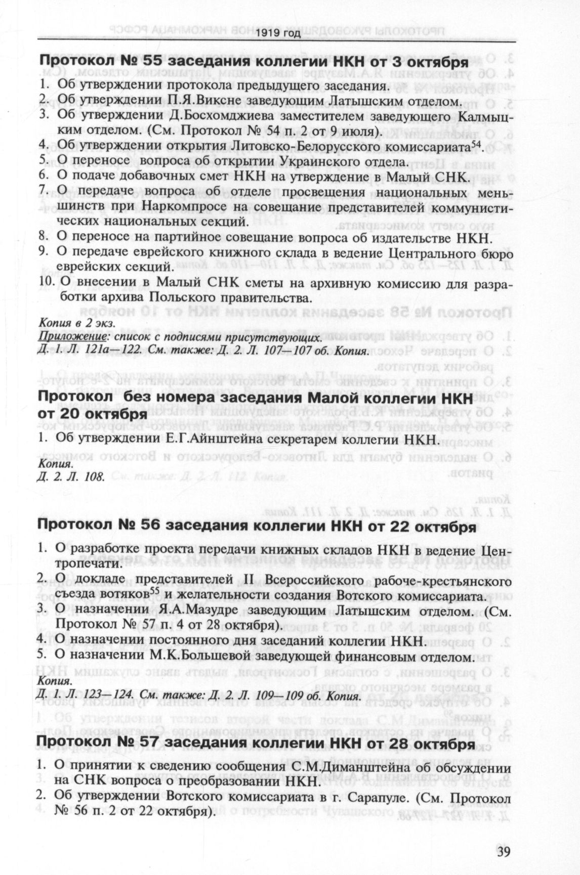 Протокол № 55 заседания коллегии НКН от 3 октября 1919 г. // ГА РФ. Ф. Р-1318. Oп. 1. Д. 1. Л. 121а—122.