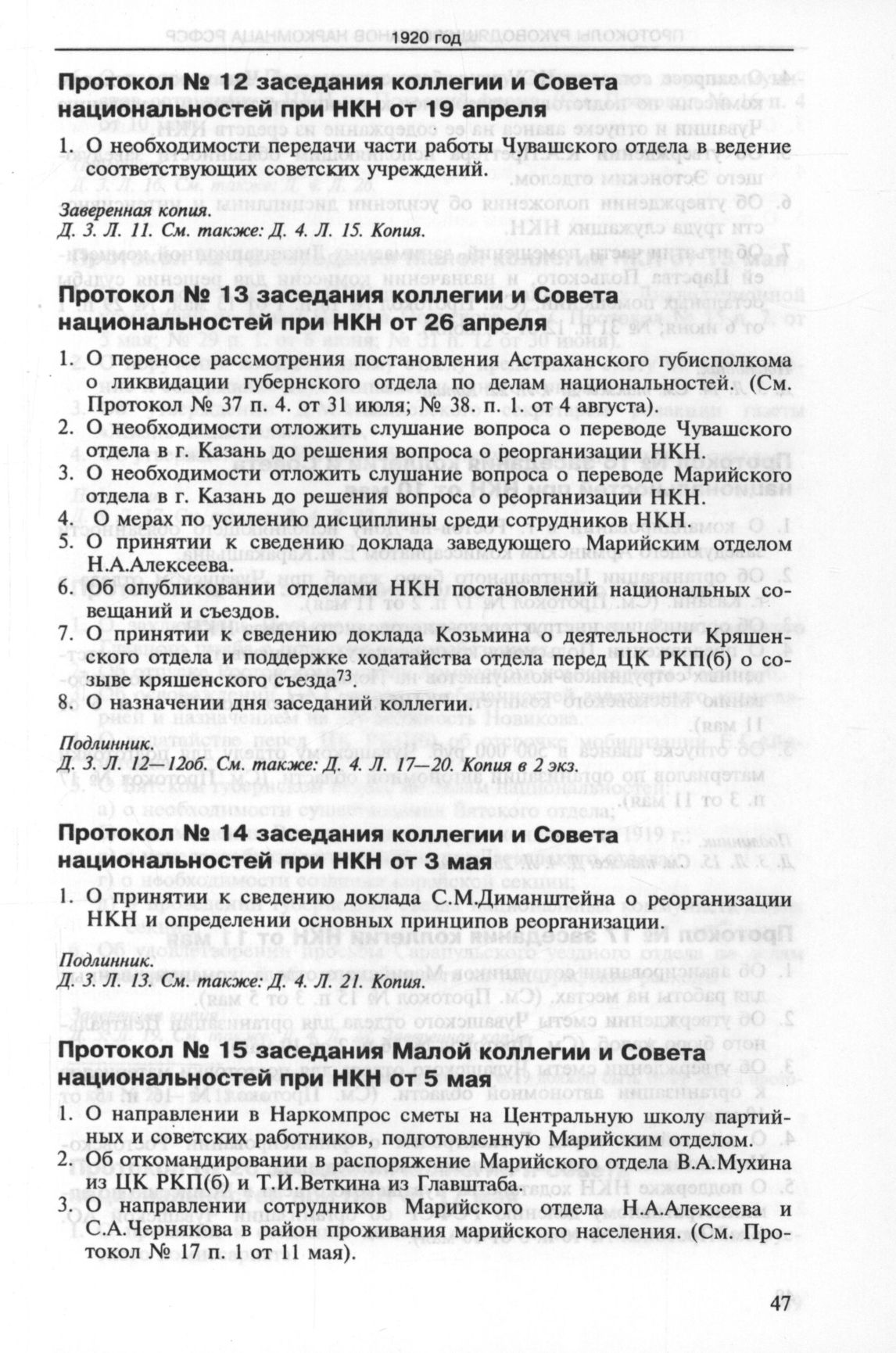 Протокол № 13 заседания коллегии и Совета национальностей при НКН от 26 апреля 1920 г. // ГА РФ. Ф. Р-1318. Oп. 1. Д. 3. Л. 12—12об.