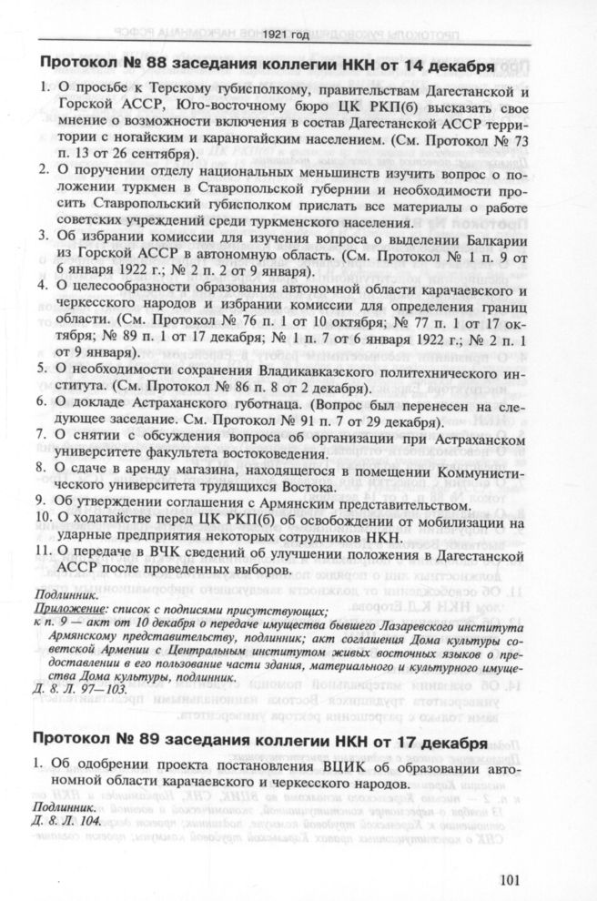 Протокол № 88 заседания коллегии НКН от 14 декабря 1921 г. // ГА РФ. Ф. Р-1318. Oп. 1. Д. 8. Л. 97-103.
