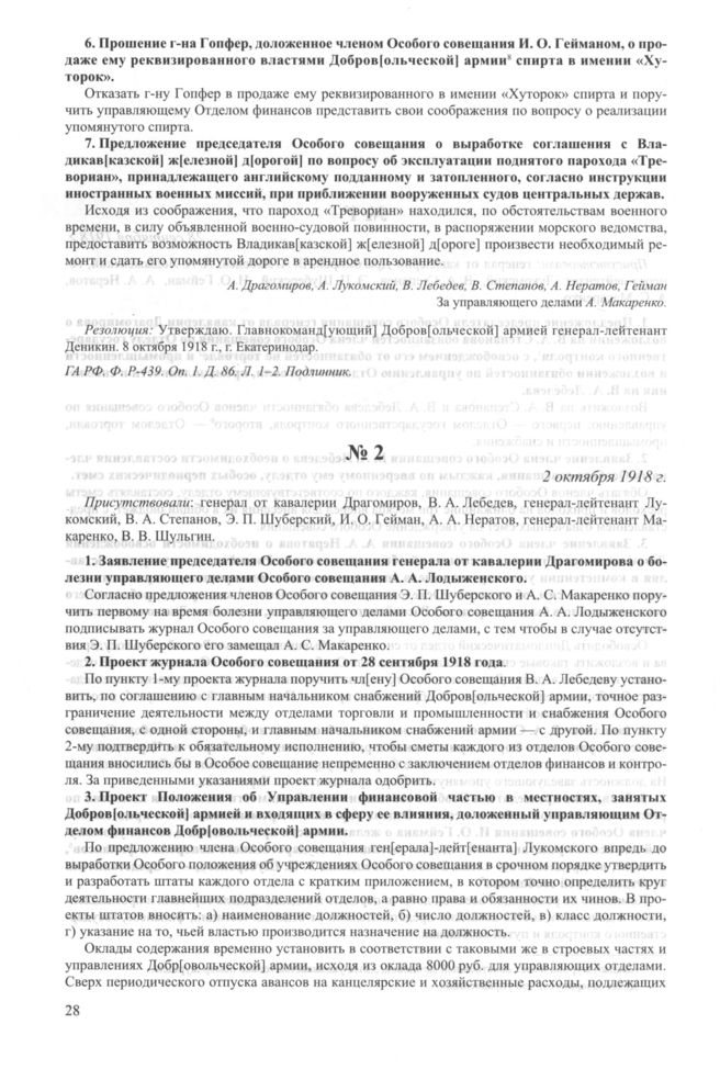 Журнал № 2 заседания Особого совещания при Главнокомандующем вооруженными силами на Юге России А.И. Деникине, 2 октября 1918 г.