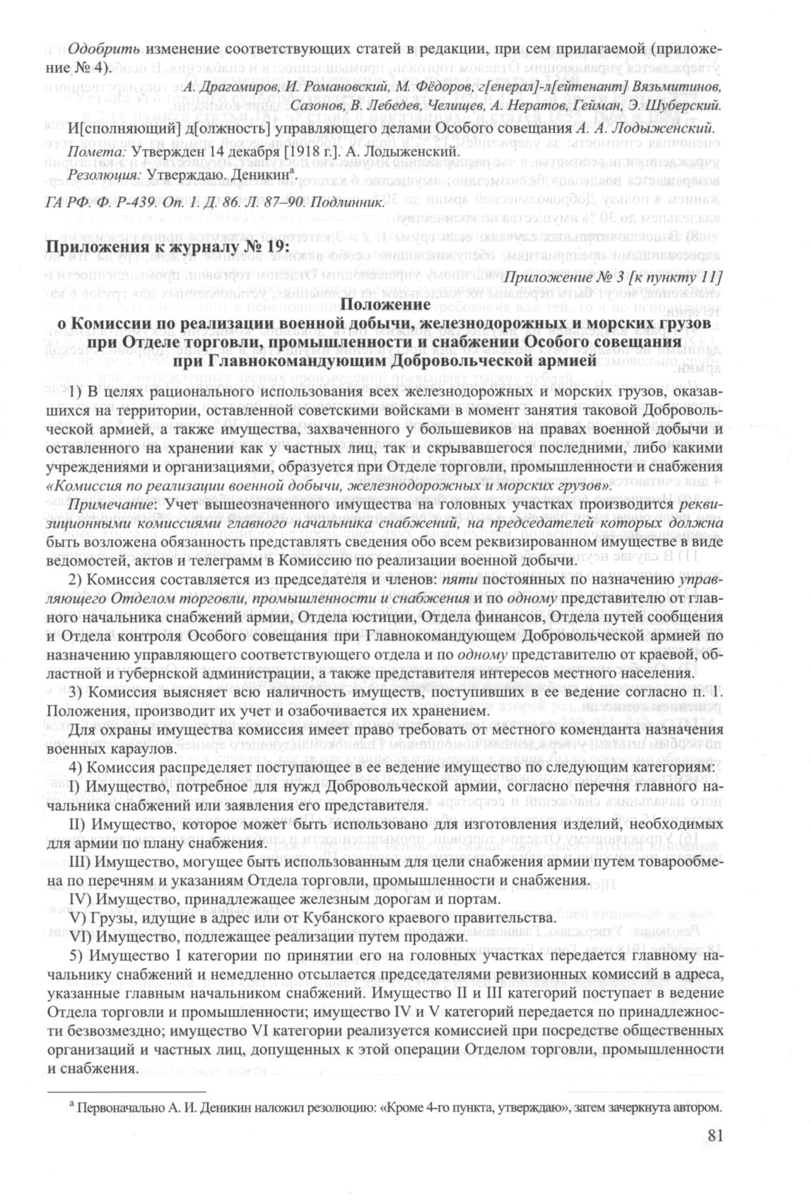 Приложение № 3 к журналу № 19 заседания Особого совещания при Главнокомандующем вооруженными силами на Юге России А.И. Деникине. 11 декабря 1918 г. Положение о Комиссии по реализации военной добычи, железнодорожных и морских грузов при Отделе торговли, промышленности и снабжении Особого совещания при Главнокомандующим Добровольческой армией // ГА РФ. Ф. P-439. Оп. 1. Д. 86. Л. 119-120 об. Подлинник.