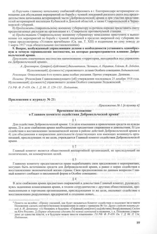 Приложение № 1 к журналу № 21 заседания Особого совещания при Главнокомандующем вооруженными силами на Юге России А.И. Деникине. 18 декабря 1918 г. Временное положение о Главном комитете содействия Добровольческой армии