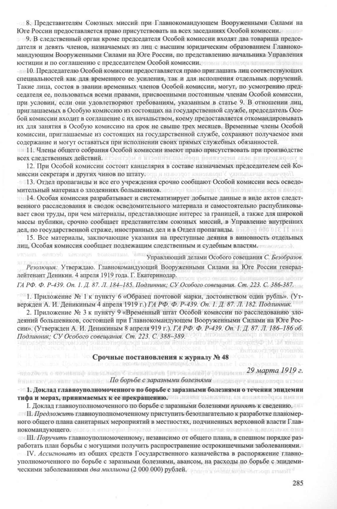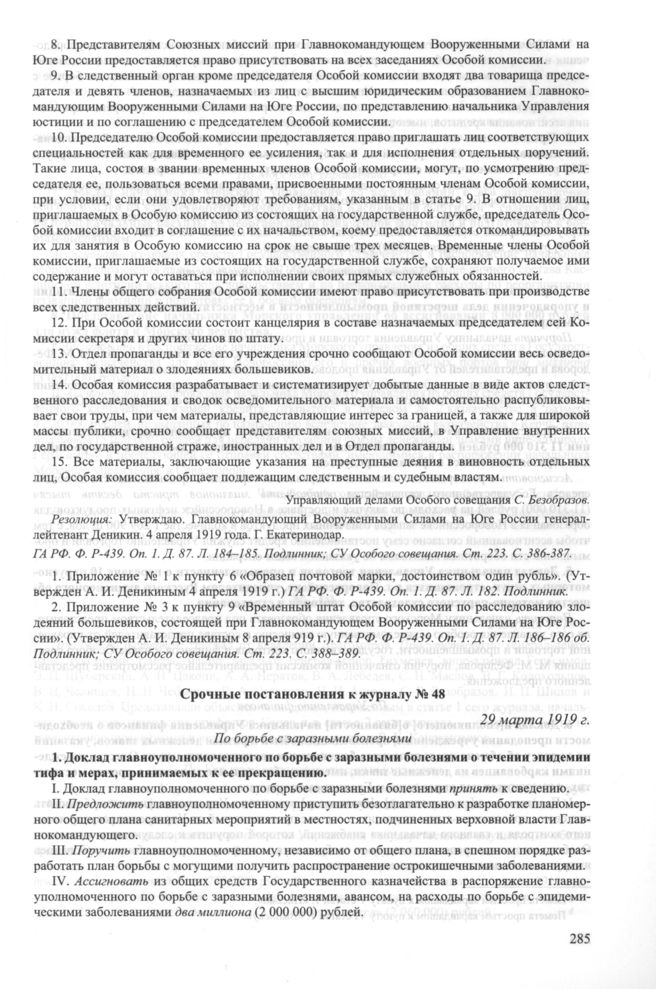 Приложение № 3 к журналу № 48 заседания Особого совещания при Главнокомандующем вооруженными силами на Юге России А.И. Деникине. 29 марта 1919 г. // ГА РФ. Ф. P-439. Оп. 1. Д. 87. Л. 186-186 об. Подлинник; СУ Особого совещания. Ст. 223. С. 388-389.