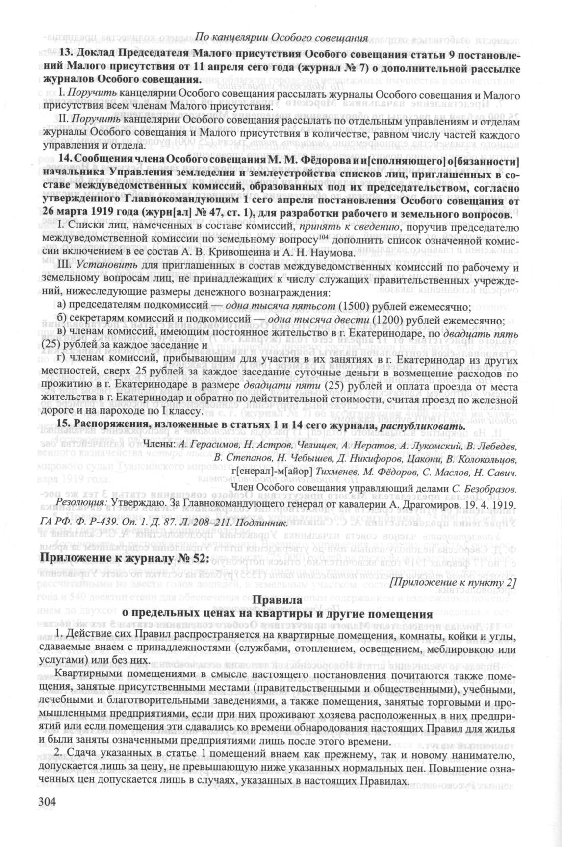 Приложение к журналу № 52 заседания Особого совещания при Главнокомандующем вооруженными силами на Юге России А.И. Деникине. 16 апреля 1919 г. Правила о предельных ценах на квартиры и другие помещения // ГА РФ. Ф. P-439. Оп. 1. Д. 87. Л. 213-221. Подлинник; СУ Особого совещания. Ст. 21. С. 77-87.