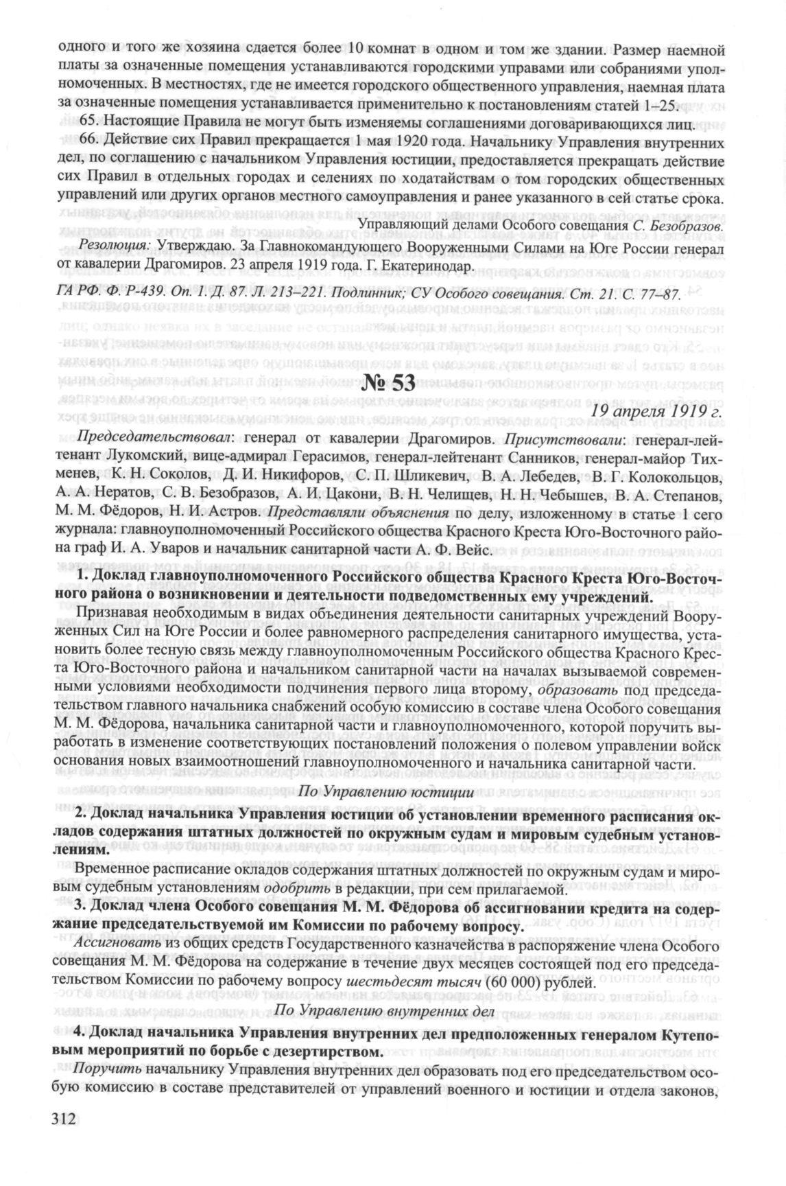 Журнал № 53 заседания Особого совещания при Главнокомандующем вооруженными силами на Юге России А.И. Деникине. 19 апреля 1919 г.