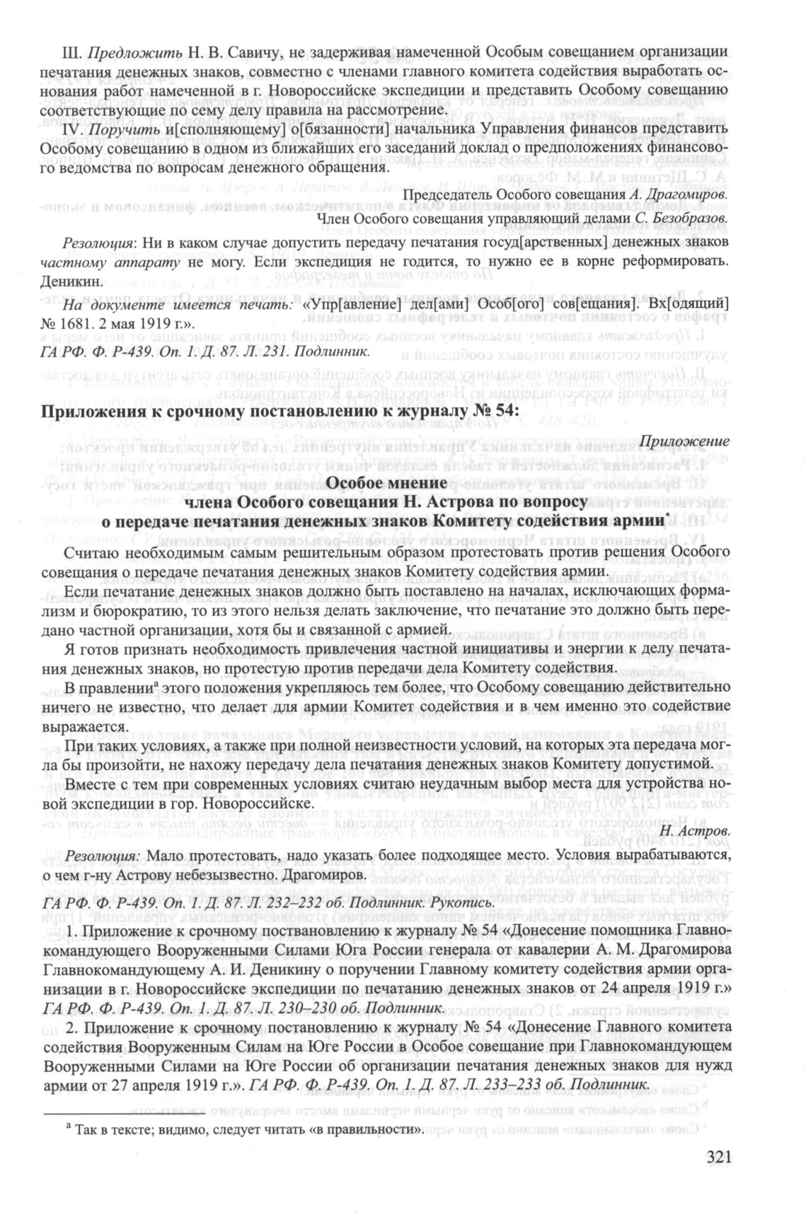 Приложение к срочному постановлению к журналу № 54 заседания Особого совещания при Главнокомандующем вооруженными силами на Юге России А.И. Деникине. 23 апреля 1919 г. // ГА РФ. Ф. P-439. Оп. 1. Д. 87. Л. 233-233 об. Подлинник.