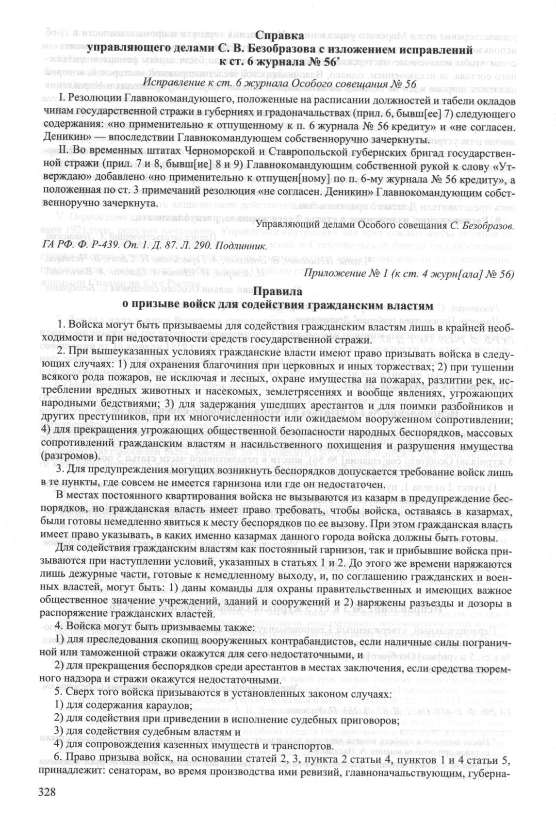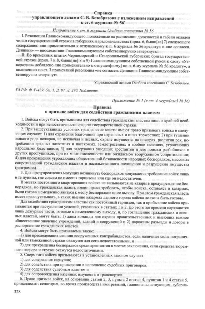 Приложение № 1 к журналу № 56 заседания Особого совещания при Главнокомандующем вооруженными силами на Юге России А.И. Деникине. 26 апреля 1919 г. Правила о призыве войск для содействия гражданским властям // ГА РФ. Ф. P-439. Оп. 1. Д. 87. Л. 269-272 об. Подлинник; СУ Особого совещания. Ст. 313. С. 462-467.
