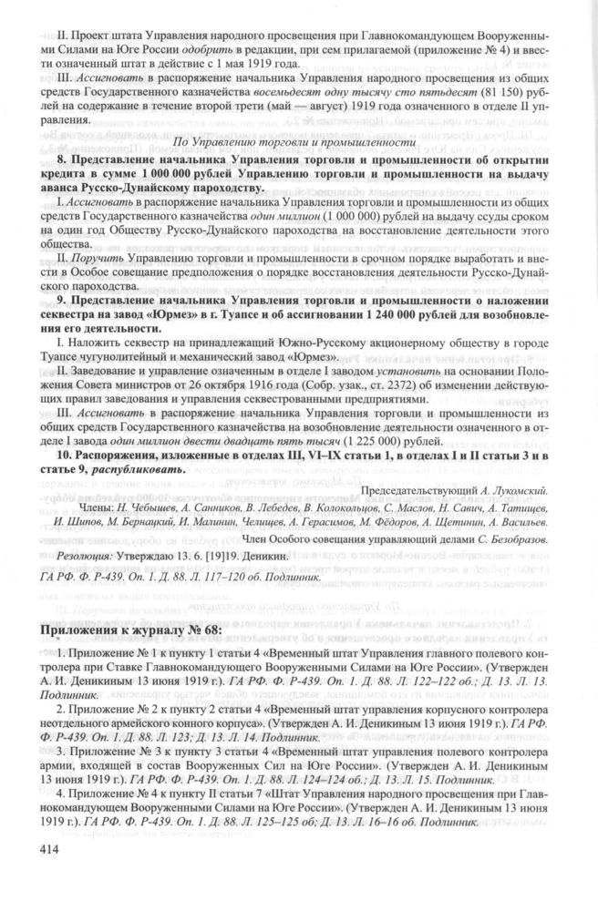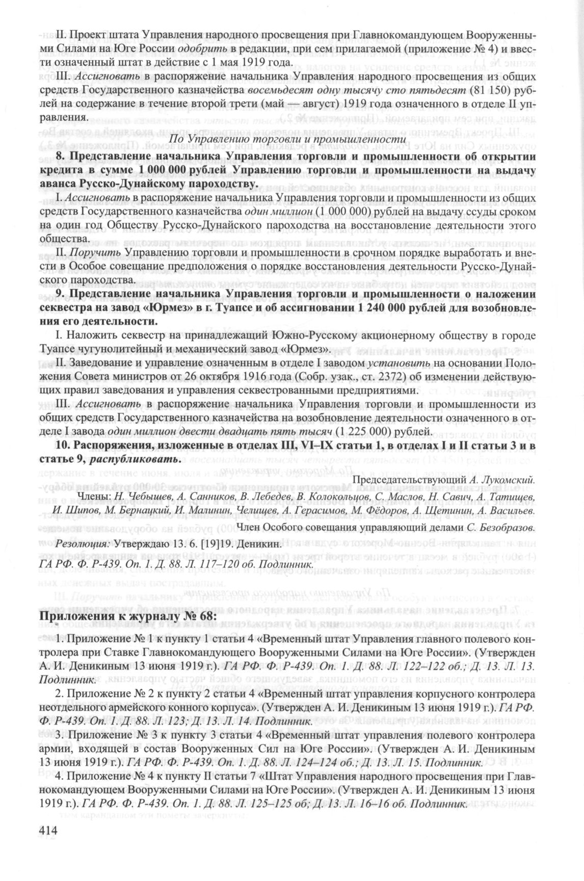 Приложение № 2 к журналу № 68 заседания Особого совещания при Главнокомандующем вооруженными силами на Юге России А.И. Деникине. 7 июня 1919 г. // ГА РФ. Ф. P-439. Оп. 1. Д. 88. Л. 123; Д. 13. Л. 14. Подлинник.