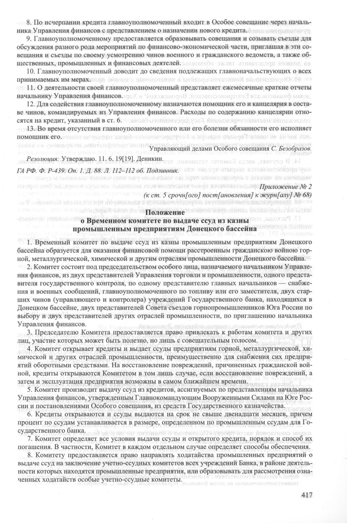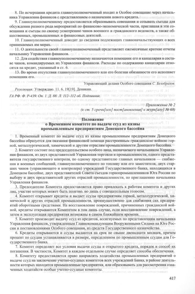 Приложение № 2 к срочному постановлению к журналу № 68 заседания Особого совещания при Главнокомандующем вооруженными силами на Юге России А.И. Деникине. 7 июня 1919 г. Положение о Временном комитете по выдаче ссуд из казны промышленным предприятиям Донецкого бассейна // ГА РФ. Ф. P-439. Оп. 1. Д. 88. Л. 113-114; Д. 13. Л. 12-12 об. Подлинник.