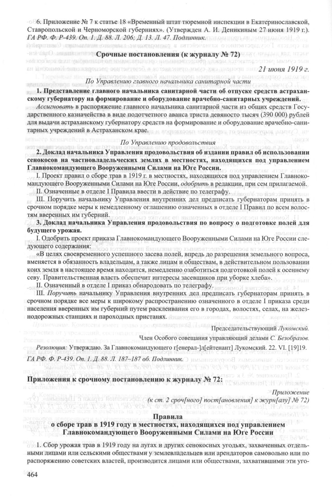 Приложение № 7 к журналу № 72 заседания Особого совещания при Главнокомандующем вооруженными силами на Юге России А.И. Деникине. 21 июня 1919 г. // ГА РФ. Ф. P-439. Оп. 1. Д. 88. Л. 206; Д. 13. Л. 47. Подлинник.