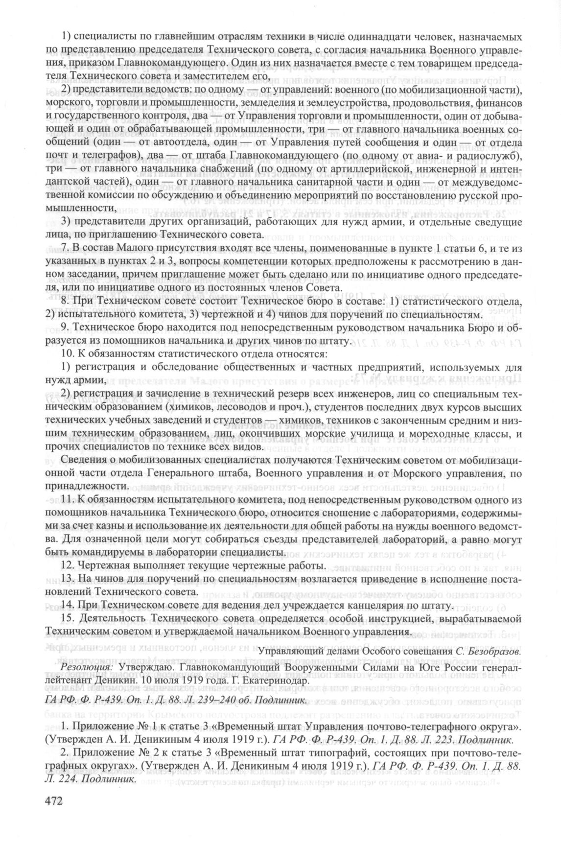 Приложение № 2 к журналу № 73 заседания Особого совещания при Главнокомандующем вооруженными силами на Юге России А.И. Деникине. 25 июня 1919 г. // ГА РФ. Ф. P-439. Оп. 1. Д. 88. Л. 224. Подлинник.