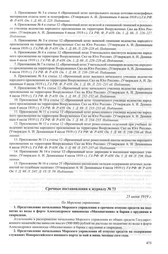 Приложение № 3 к журналу № 73 заседания Особого совещания при Главнокомандующем вооруженными силами на Юге России А.И. Деникине. 25 июня 1919 г. // ГА РФ. Ф. P-439. Оп. 1. Д. 88. Л. 225. Подлинник.