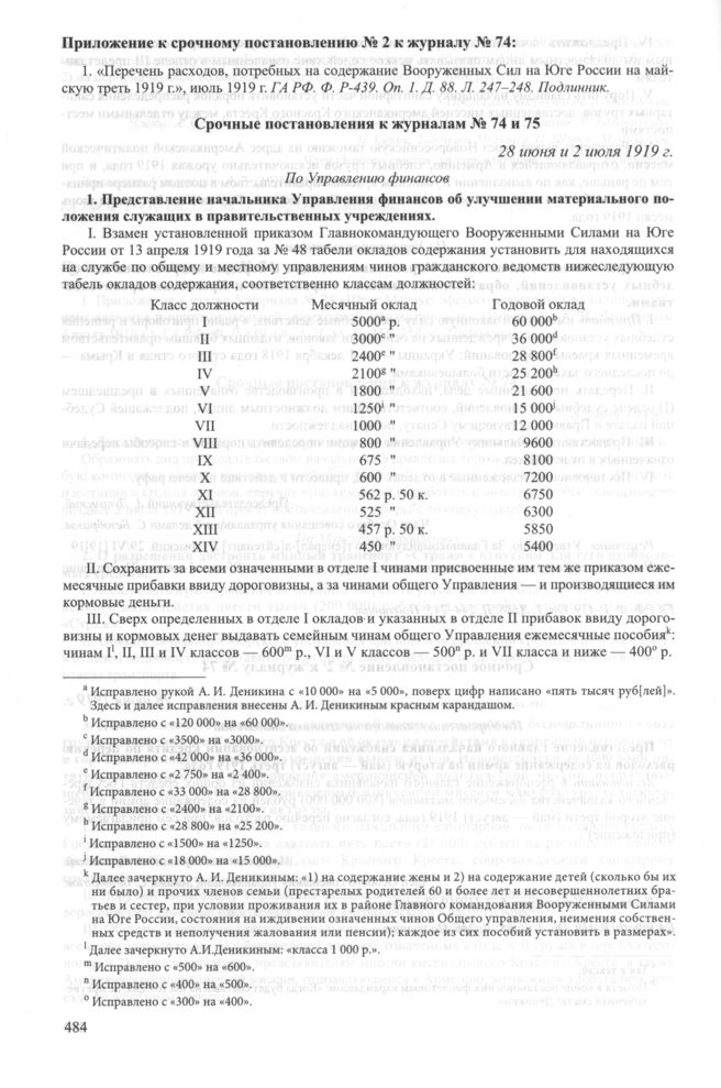 Приложение к журналам № 74 и 75 заседаний Особого совещания при Главнокомандующем вооруженными силами на Юге России А.И. Деникине. 28 июня и 2 июля 1919 г. Срочные постановления к журналам № 74 и 75. 28 июня и 2 июля 1919 г. // ГА РФ. Ф. P-439. Оп. 1. Д. 88. Л. 242-243 об.; Д. 13. Л. 61. Подлинник.