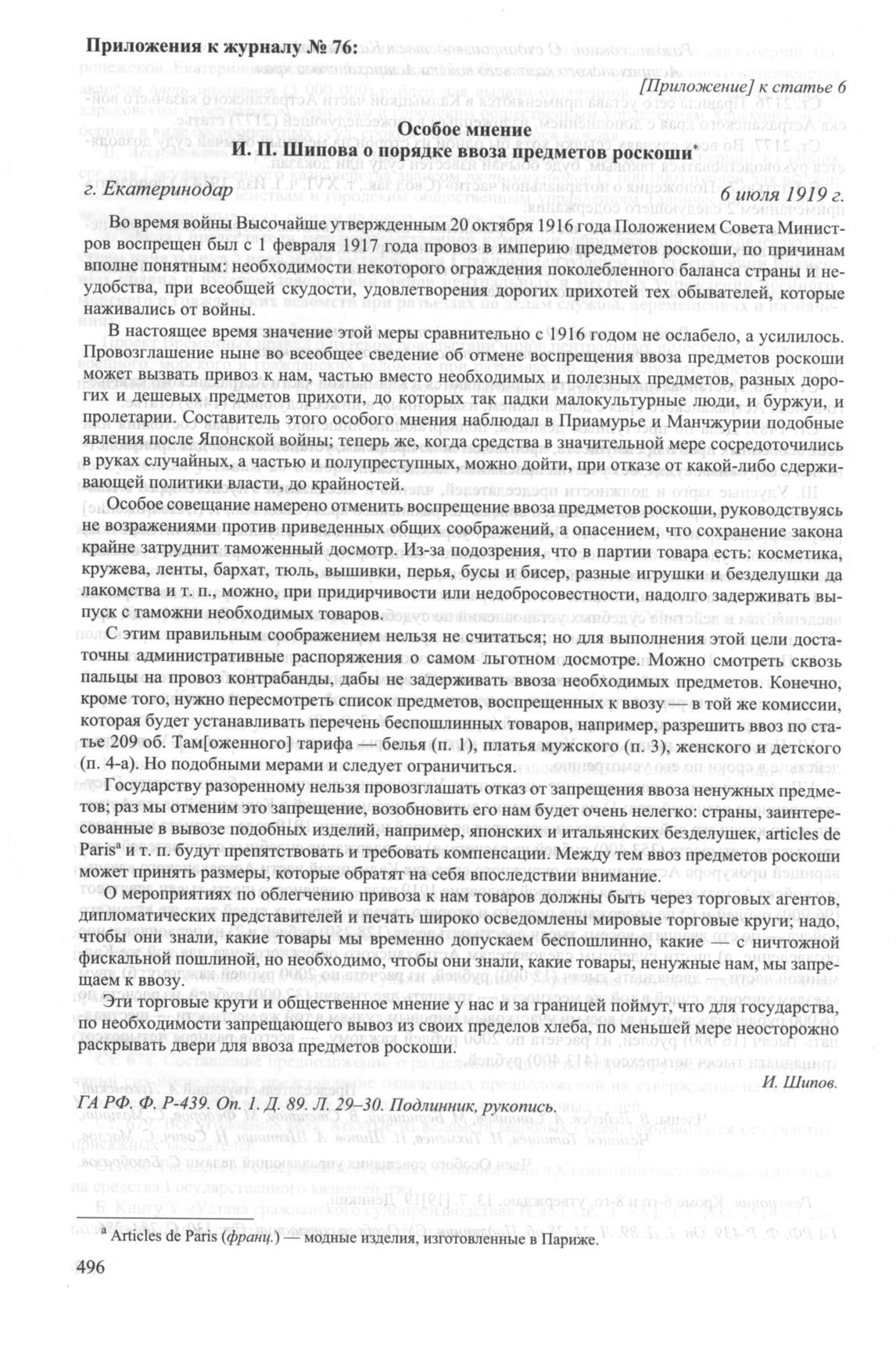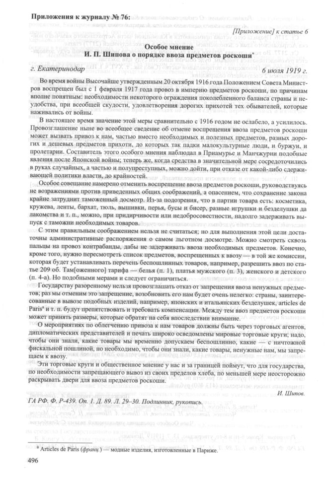 Приложение к журналу № 76 заседания Особого совещания при Главнокомандующем вооруженными силами на Юге России А.И. Деникине. 5 июля 1919 г. Особое мнение И. П. Шипова о порядке ввоза предметов роскоши, г. Екатеринодар. 6 июля 1919 г. // ГА РФ. Ф. P-439. Оп. 1. Д. 89. Л. 29-30. Подлинник, рукопись.