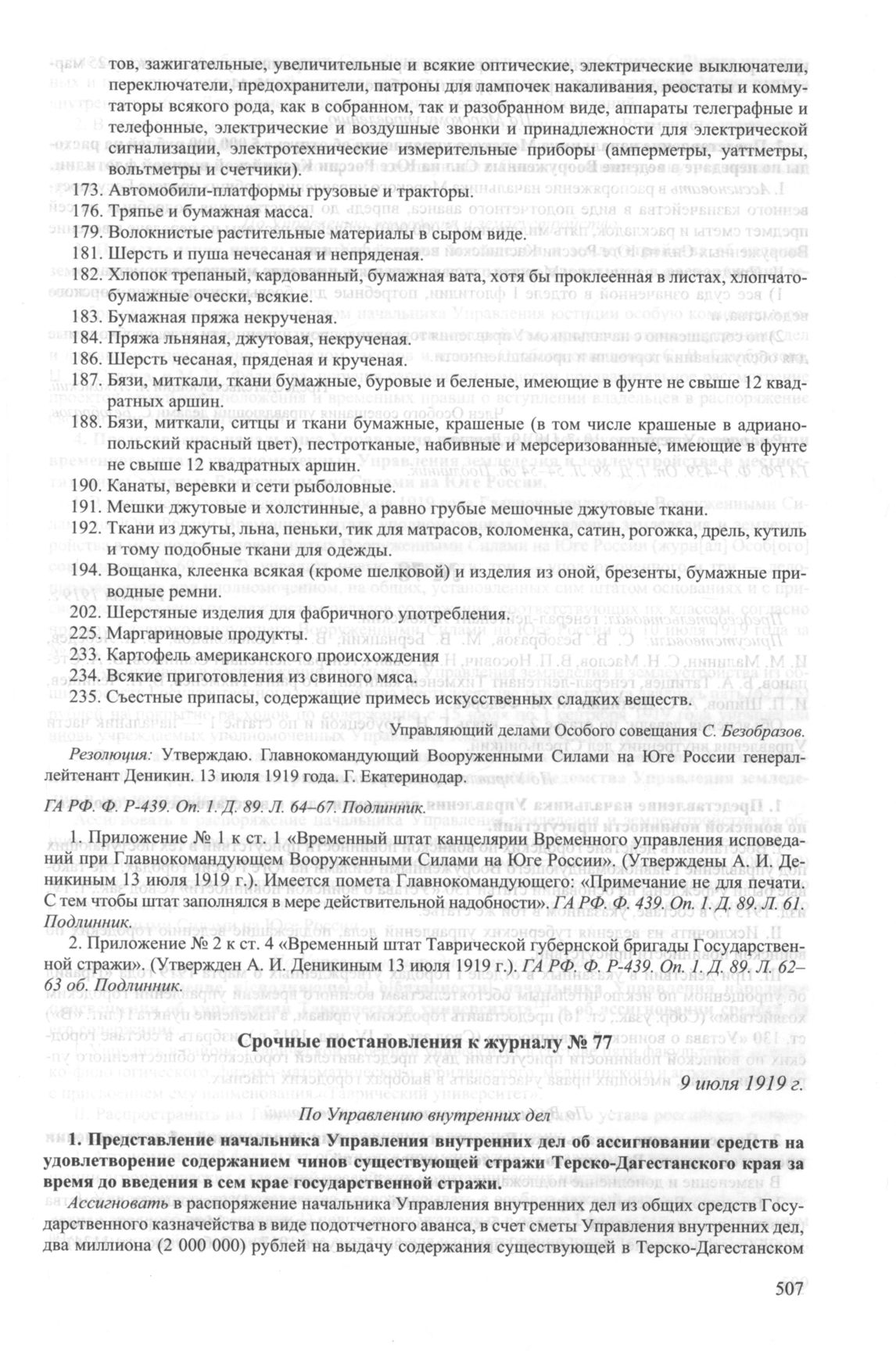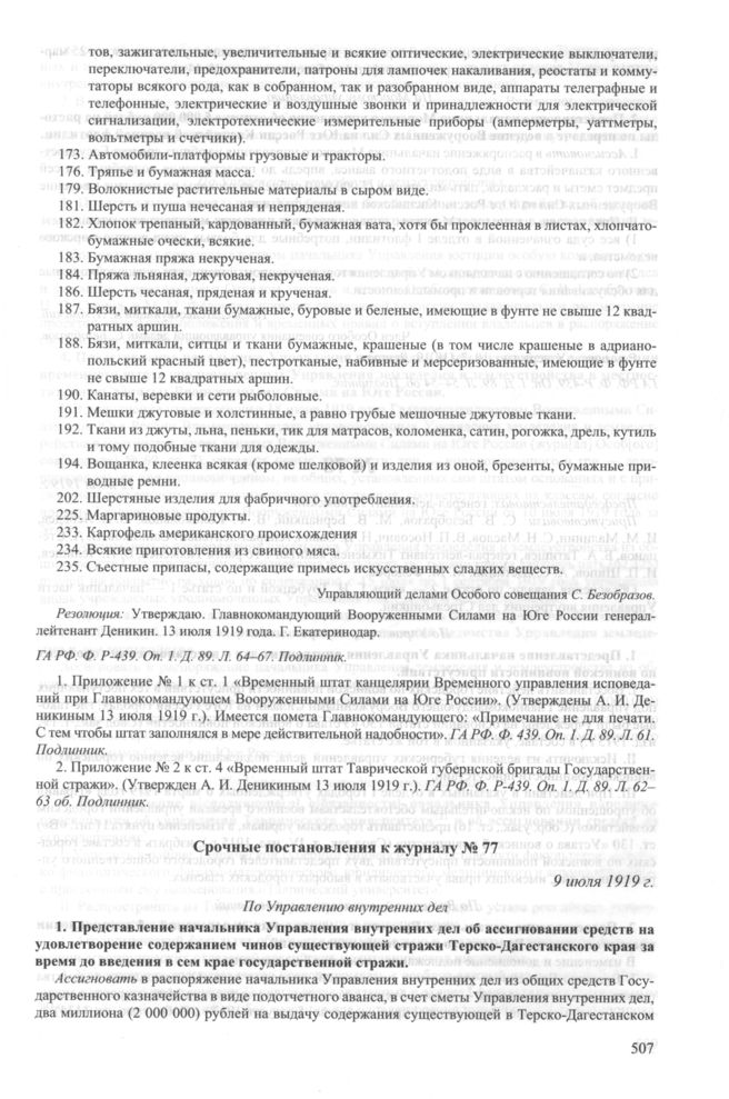 Приложение № 2 к журналу № 77 заседания Особого совещания при Главнокомандующем вооруженными силами на Юге России А.И. Деникине. 9 июля 1919 г. // ГА РФ. Ф. P-439. Оп. 1. Д. 89. Л. 62-63 об. Подлинник.