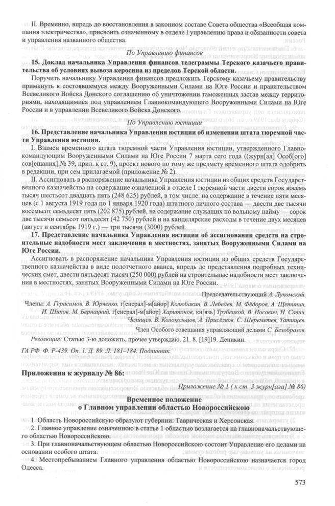 Приложение № 1 к журналу № 86 заседания Особого совещания при Главнокомандующем вооруженными силами на Юге России А.И. Деникине. 16 августа 1919 г. Временное положение о Главном управлении областью Новороссийскою // ГА РФ. Ф. P-439. Оп. 1. Д. 89. Л. 186-188 об. Подлинник; СУ Особого совещания. Ст. 134. С. 315-318.