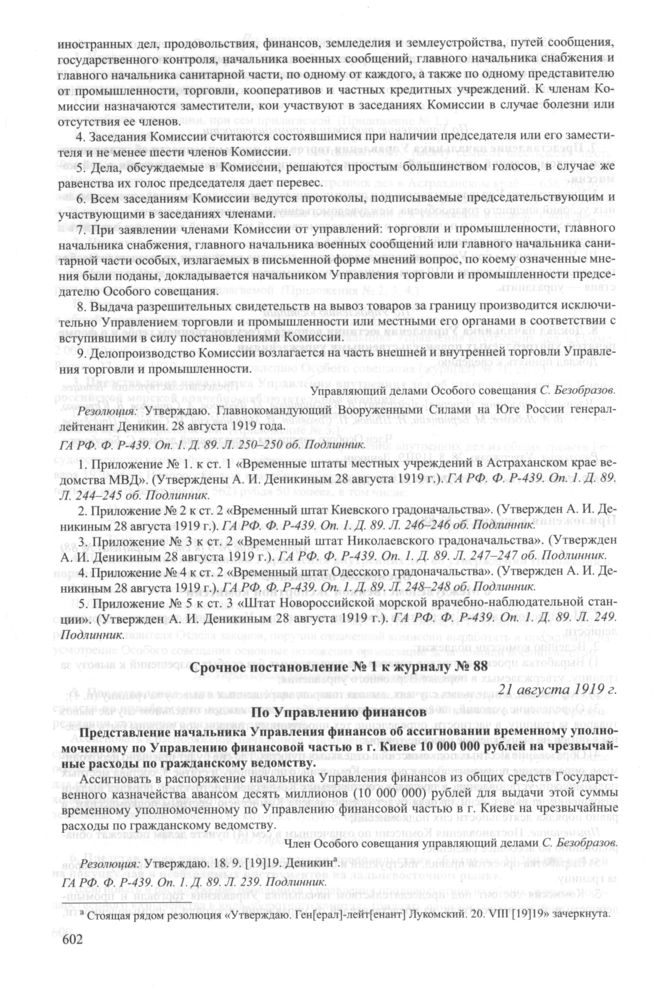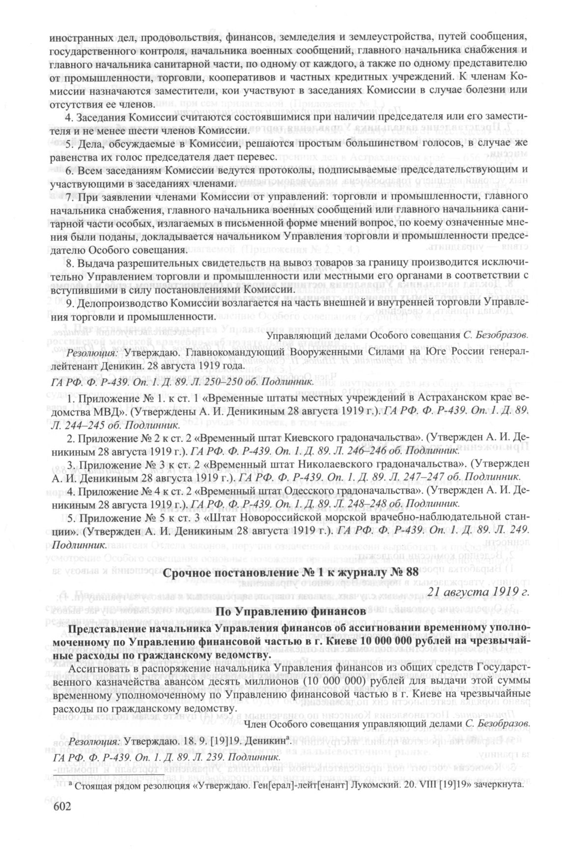 Приложение к журналу № 88 заседания Особого совещания при Главнокомандующем вооруженными силами на Юге России А.И. Деникине. 23 августа 1919 г. Срочное постановление № 1 к журналу № 88. 21 августа 1919 г. // ГА РФ. Ф. P-439. Оп. 1. Д. 89. Л. 239. Подлинник.
