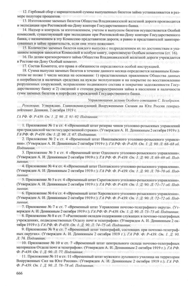 Приложение № 11 к журналу № 95 заседания Особого совещания при Главнокомандующем вооруженными силами на Юге России А.И. Деникине. 17 сентября 1919 г. // ГА РФ. Ф. P-439. Оп. 1. Д. 90. Л. 78-78 об. Подлинник.
