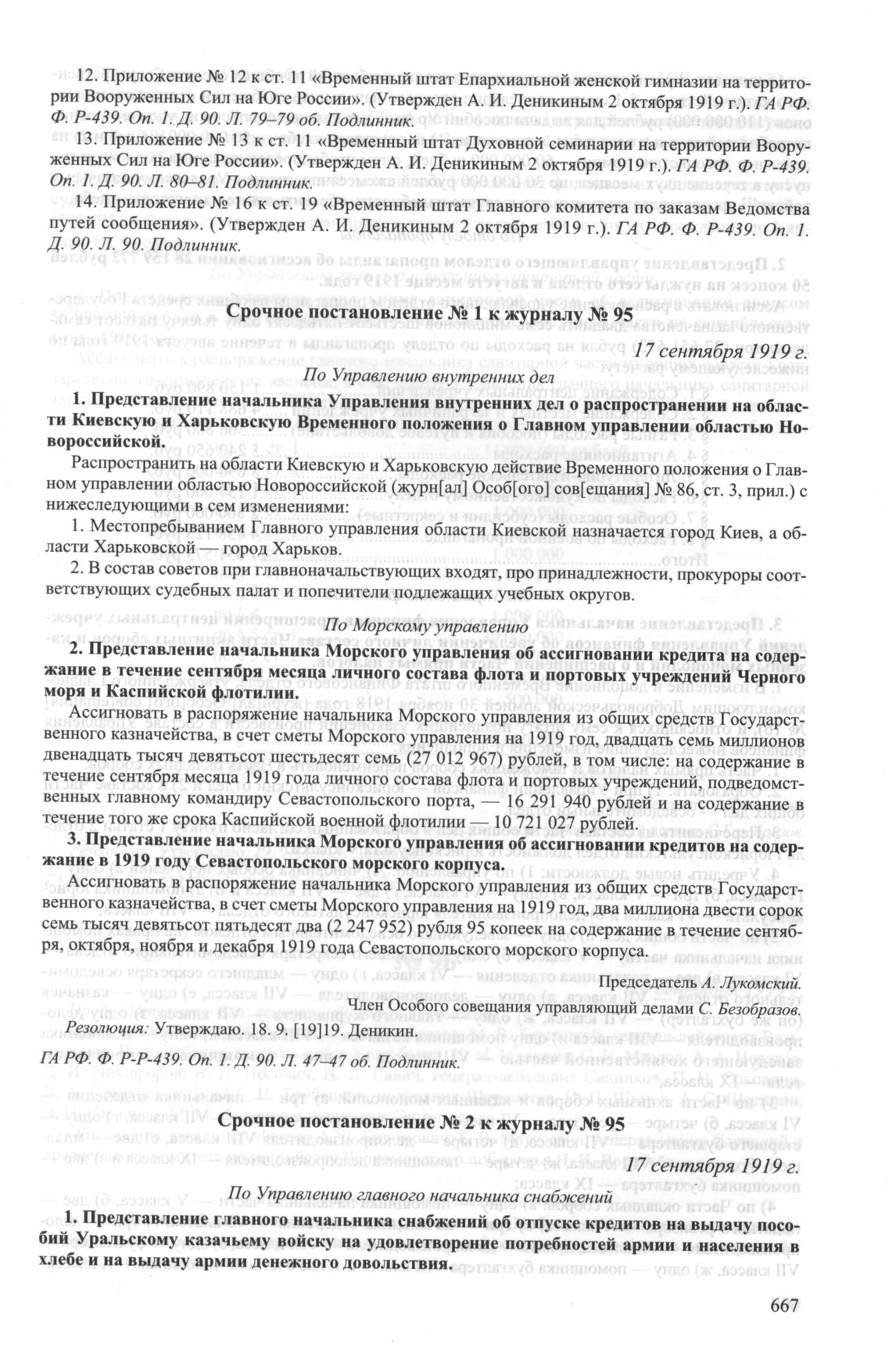 Приложение № 13 к журналу № 95 заседания Особого совещания при Главнокомандующем вооруженными силами на Юге России А.И. Деникине. 17 сентября 1919 г. // ГА РФ. Ф. Р-439. Оп. 1. Д. 90. Л. 80—81. Подлинник.