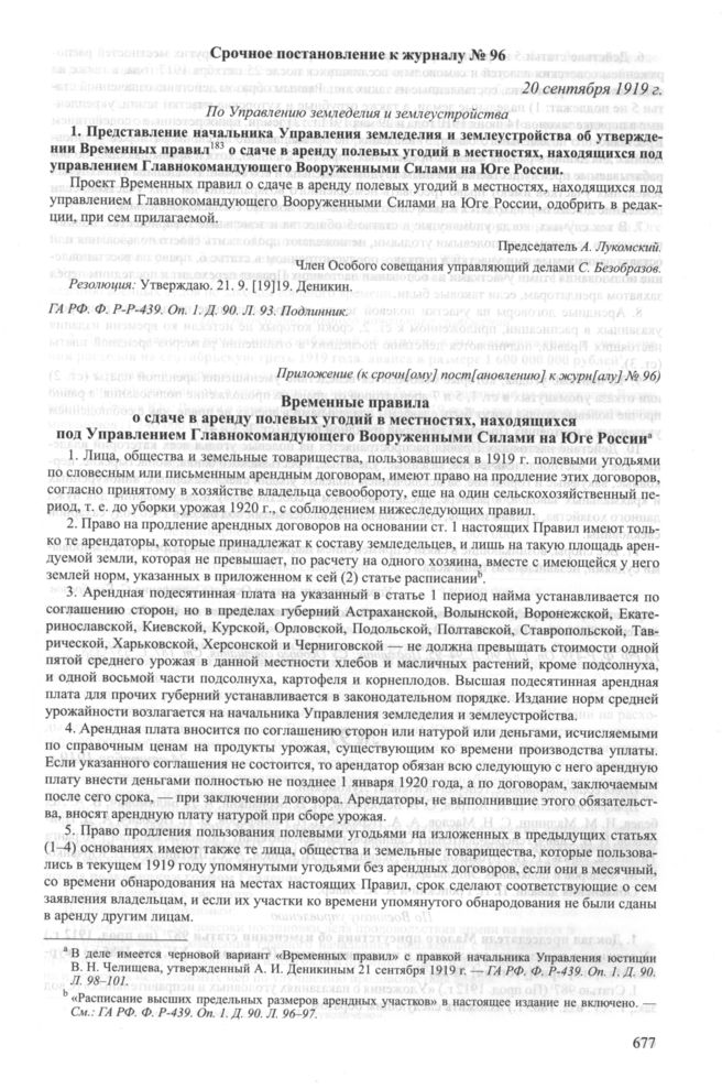 Приложение к журналу № 96 заседания Особого совещания при Главнокомандующем вооруженными силами на Юге России А.И. Деникине. 20 сентября 1919 г. Срочное постановление к журналу № 96. 20 сентября 1919 г. // ГА РФ. Ф. Р-Р-439. Оп. 1. Д. 90. Л. 93. Подлинник.