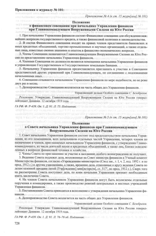 Приложение № 4 к журналу № 101 заседания Особого совещания при Главнокомандующем вооруженными силами на Юге России А.И. Деникине. 8 октября 1919 г. Положение о финансовом совещании при начальнике Управления финансов при Главнокомандующем Вооруженными Силами на Юге России