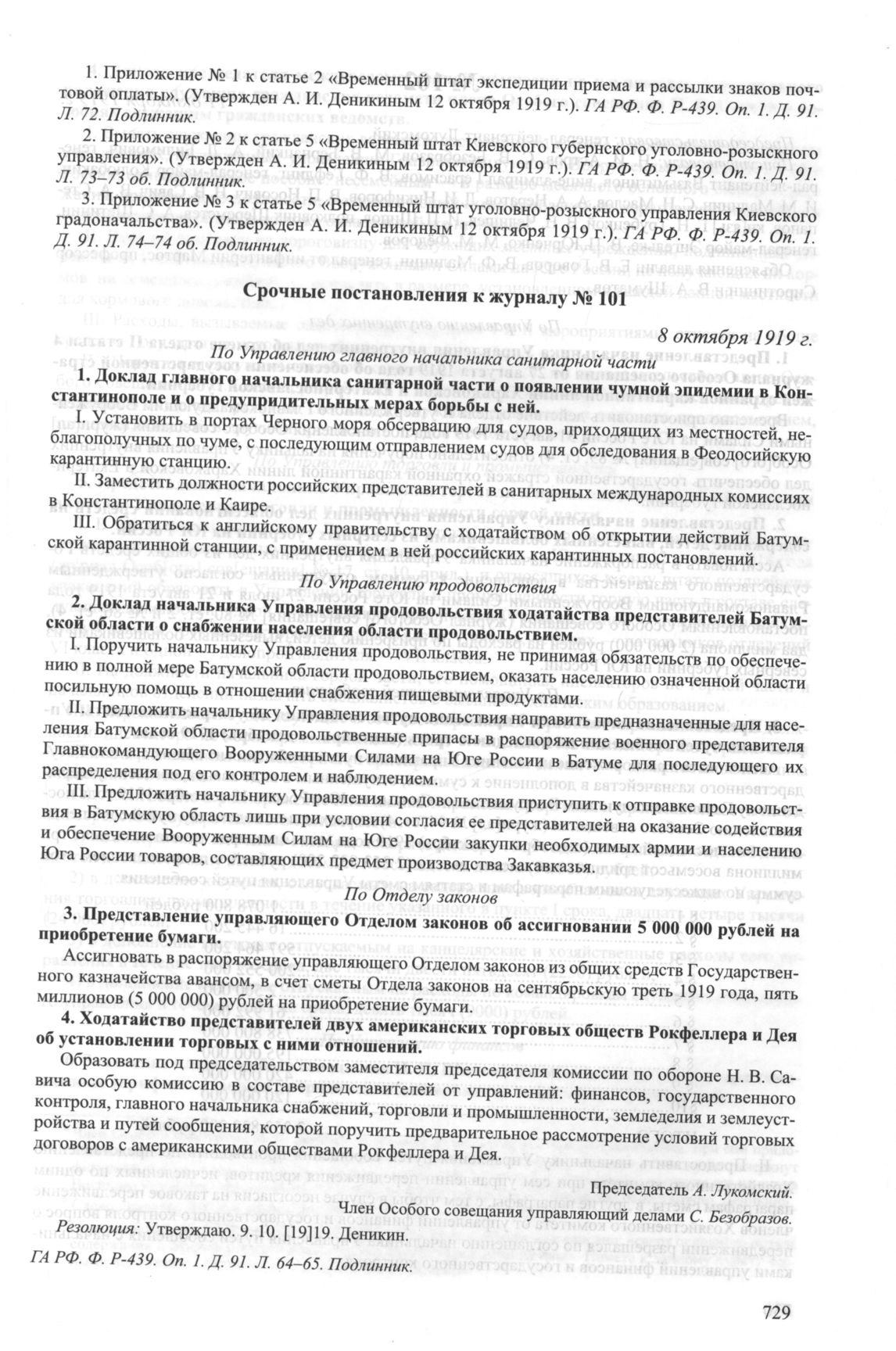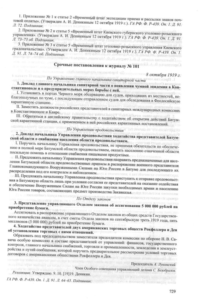 Приложение № 1 к журналу № 101 заседания Особого совещания при Главнокомандующем вооруженными силами на Юге России А.И. Деникине. 8 октября 1919 г. // ГА РФ. Ф. P-439. Оп. 1. Д. 91. Л. 72. Подлинник.