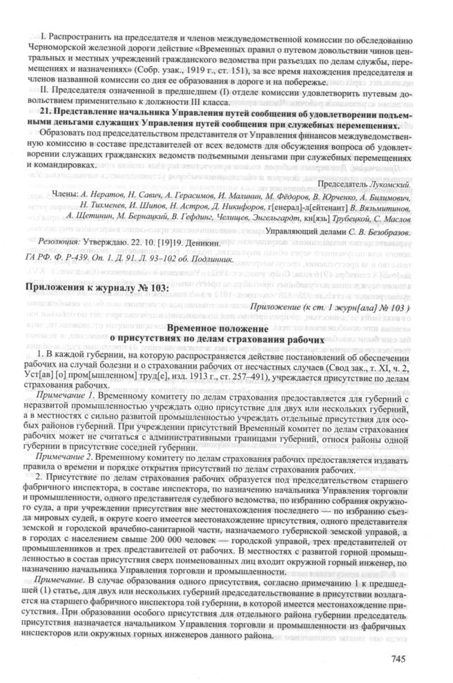 Приложение к журналу № 103 заседания Особого совещания при Главнокомандующем вооруженными силами на Юге России А.И. Деникине. 15 октября 1919 г. Временное положение о присутствиях по делам страхования рабочих // ГА РФ. Ф. P-439. Оп. 1. Д. 91. Л. 103-106 об. Подлинник; СУ Особого совещания. Ст. 326. С. 508-513.
