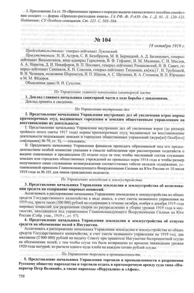 Журнал № 104 заседания Особого совещания при Главнокомандующем вооруженными силами на Юге России А.И. Деникине. 18 октября 1919 г.