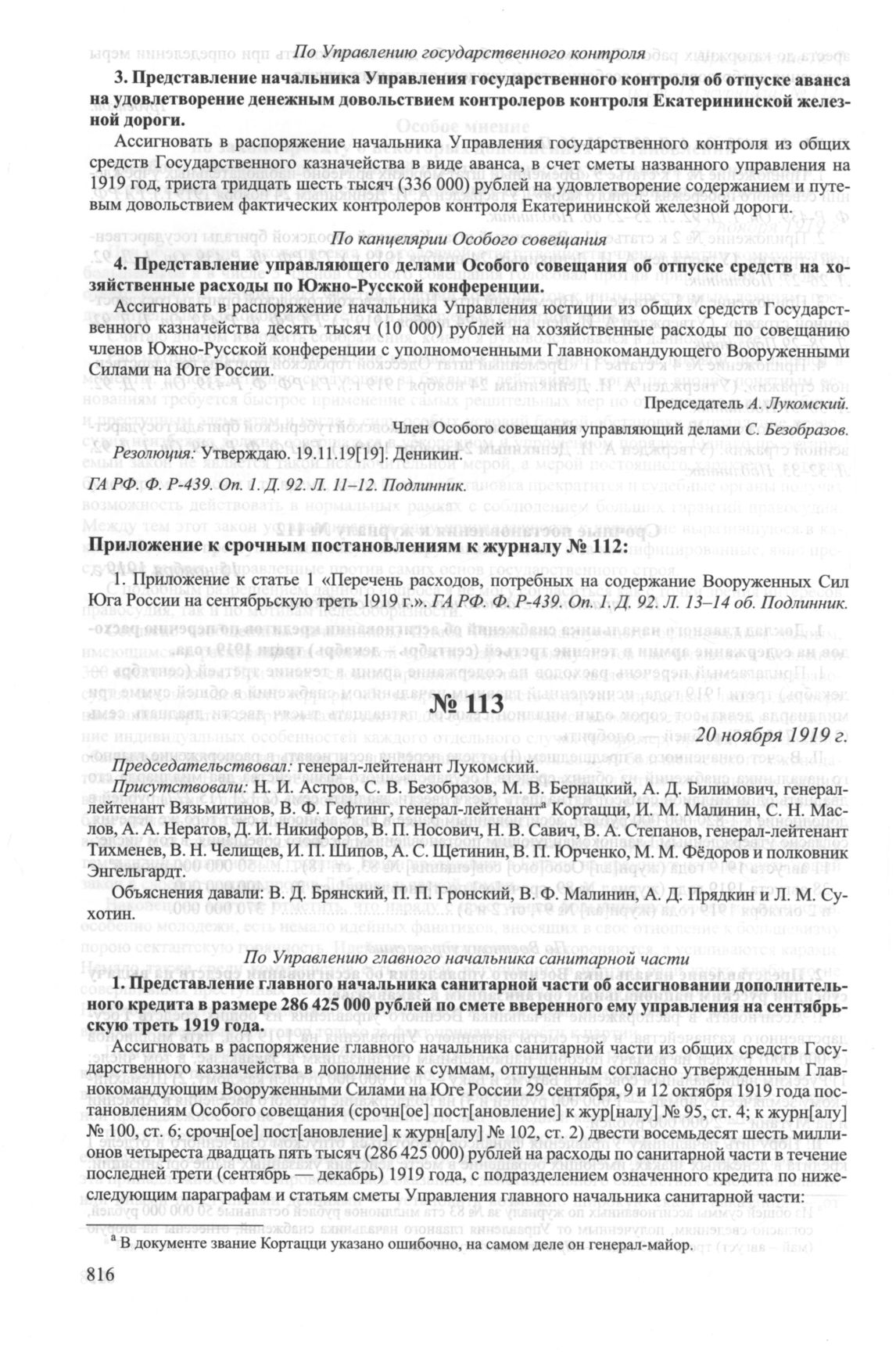 Журнал № 113 заседания Особого совещания при Главнокомандующем вооруженными силами на Юге России А.И. Деникине. 20 ноября 1919 г. // ГА РФ. Ф. P-439. Оп. 1. Д. 92. Л. 39-44 об. Подлинник.