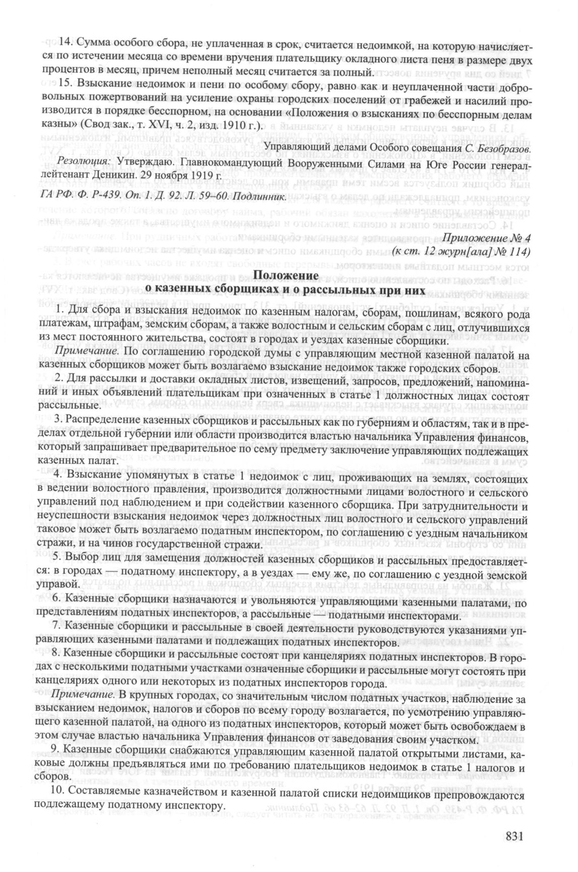 Приложение № 4 к журналу № 114 заседания Особого совещания при Главнокомандующем вооруженными силами на Юге России А.И. Деникине. 22 ноября 1919 г. Положение о казенных сборщиках и о рассыльных при них