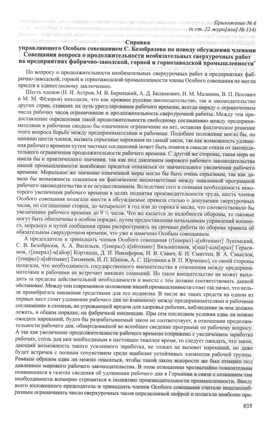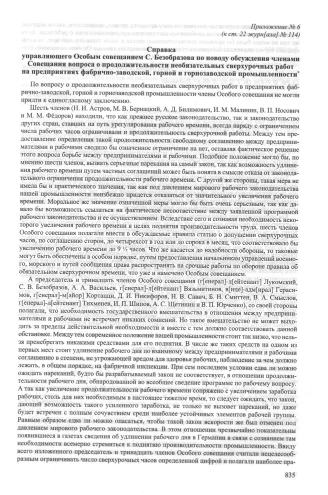 Приложение № 6 к журналу № 114 заседания Особого совещания при Главнокомандующем вооруженными силами на Юге России А.И. Деникине. 22 ноября 1919 г. Справка управляющего Особым совещанием С. Безобразова по поводу обсуждения членами Совещания вопроса о продолжительности необязательных сверхурочных работ на предприятиях фабрично-заводской, горной и горнозаводской промышленности
