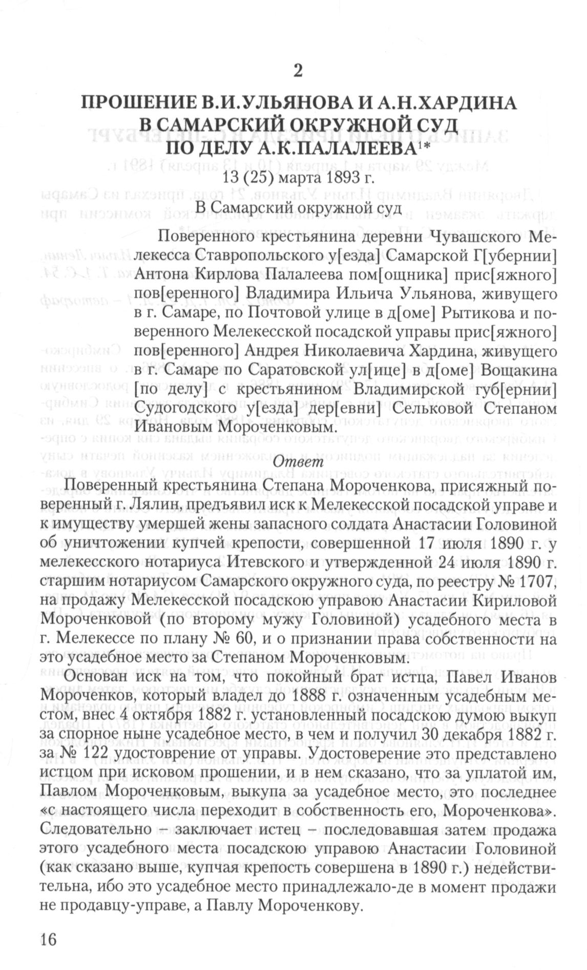 Поверенного крестьянина деревни Чувашского Мелекесса Ставропольского у[езда] Самарской Г[убернии] Антона Кирлова Палалеева помощ[ника] присяж[ного] повер[енного] Владимира Ильича Ульянова, живущего в г. Самаре, по Почтовой улице в д[оме] Рытикова и поверенного Мелекесской посадской управы прис[яжного] пов[еренного] Андрея Николаевича Хардина, живущего в г. Самаре по Саратовской ул[ице] в д[оме] Вощакина [по делу] с крестьянином Владимирской губ[ернии] Судогодского у[езда] дер[евни] Сельковой Степаном Ивановым Мороченковым.