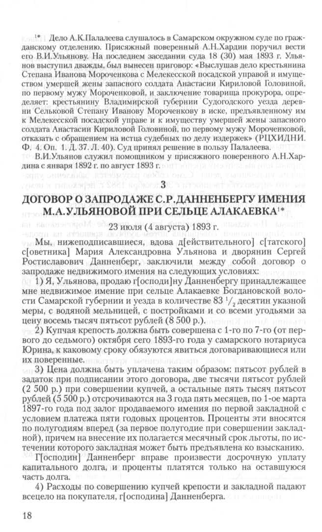 - a. ↑ Хутор при сельце Алакаевка, в 50 верстах от г. Самары, был приобретен М.Т.Елизаровым у землевладельца К.М.Сибирякова по поручению семьи Ульяновых за 7 500 рублей. Документы на покупку были оформлены на имя М.А.Ульяновой. Публикуемый договор, однако, был аннулирован, продажа-покупка не состоялась. Хутор был продан в 1897 г. крестьянину Х.С.Данилову.