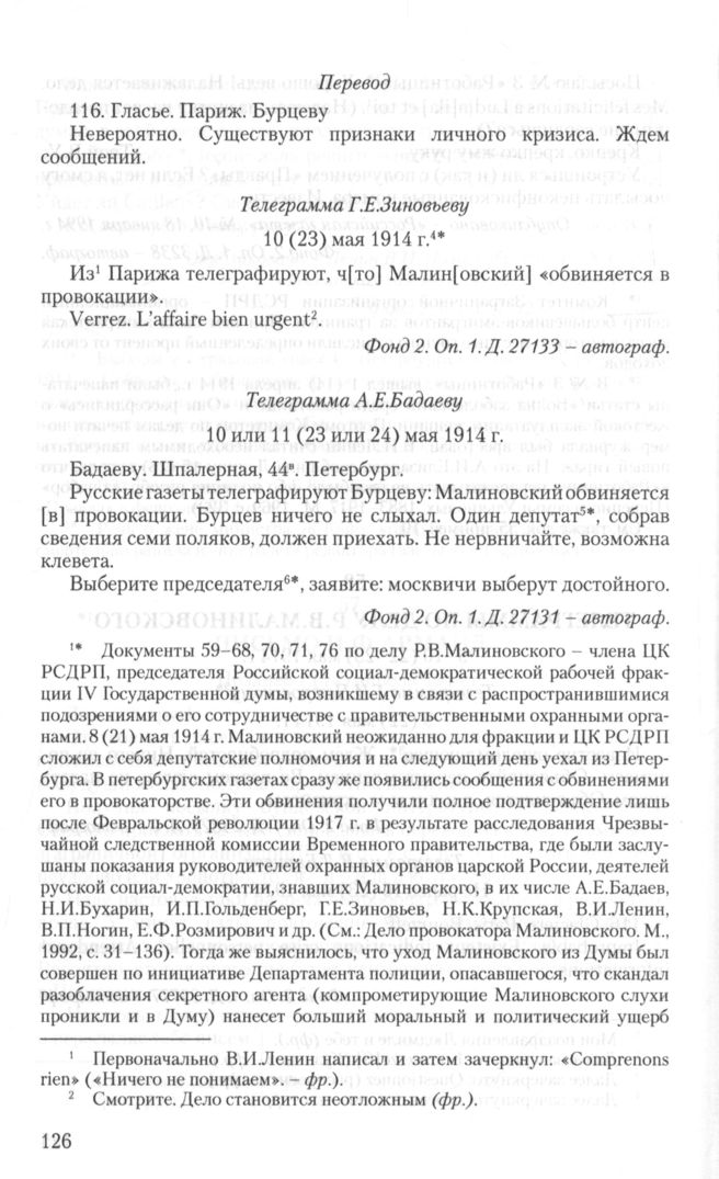 Телеграммы по делу Р.В. Малиновского. 9-10 (22-23) мая 1914 г. Телеграмма Г.Е. Зиновьеву. 10 (23) мая 1914 г.