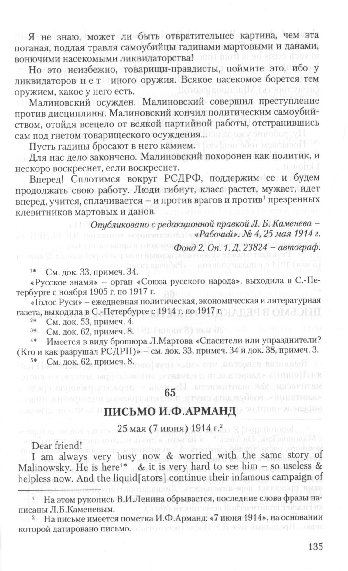 - 2. ↑ Дорогой друг! Я сейчас очень занят и обеспокоен все той же историей с Малиновским. Он здесь [a] и на него, в столь плохом настроении и беспомощного, очень трудно смотреть. А ликвидаторы продолжают свою позорную кампанию клеветы и шантажа. Связываюсь с Братом по телеграфу - но мелкие недоразумения с ним по-прежнему остаются. Вообще-то он очень добрый и достойный человек, но иногда, как в эту кризисную ситуацию, временами проявляет нерешительность. Ликвидаторы опубликовали (если мы правильно поняли телеграмму), что мы знали, конечно, нечто ужасное (слухи) насчет политической нечестности (англ.).