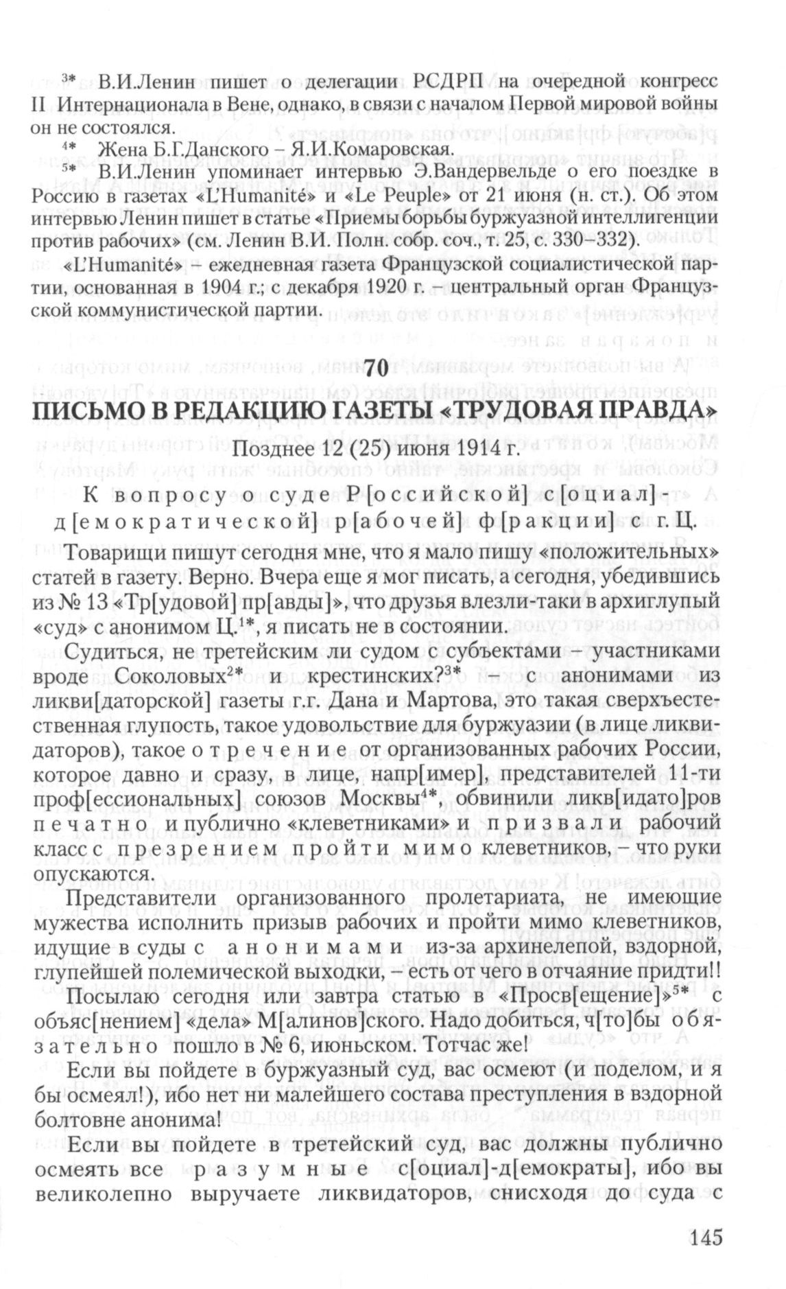 Если вы пойдете в третейский суд, вас должны публично осмеять все р а з у м н ы е с[оциал]-д[емократы], ибо вы великолепно выручаете ликвидаторов, снисходя до суда с анонимом от Дана и Мартова из-за глупенькой клеветы. Из-за чего суд? Наклеветал на Р[оссийскую] с[оциал]-д[емократическую] р[абочую] фр[акцию], что она «покрывает»?