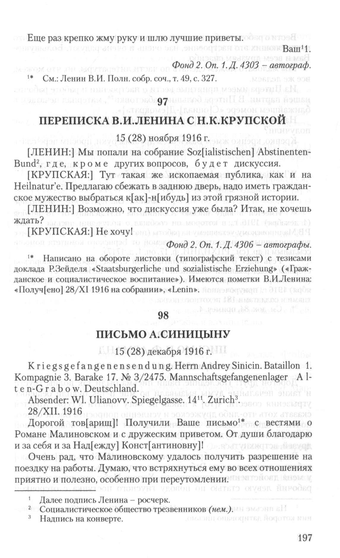 - a. ↑ Написано на обороте листовки (типографский текст) с тезисами доклада Р.Зейделя «Staatsburgerliche und sozialistische Erziehung» («Гражданское и социалистическое воспитание»). Имеются пометки В.И.Ленина: «Получ[ено] 28/XI 1916 на собрании», «Lenin».
