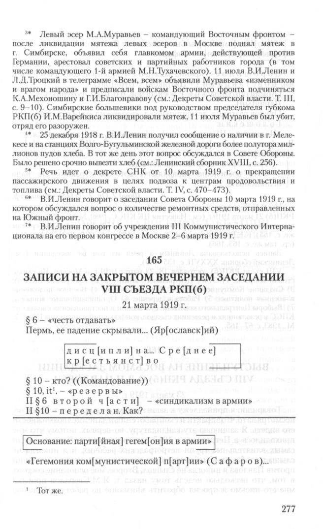 - a. ↑ В.И.Ленина вел записи на закрытом вечернем заседании VIII съезда РКП(б) 21 марта 1919 г. (см.: Известия ЦК КПСС, 1989, № 11, с. 144-176) по выступлениям Е.М.Ярославского (ср.: там же, с. 152), Г.И.Сафарова (ср.: там же, с. 155), К.Е.Ворошилова (ср.: там же, с. 159, 161-162), Ф.И.Голощекина (ср.: там же, с. 165,166). Запись использована Лениным в речи на том же заседании (см.: Ленинский сборник XXXVII, с. 135-140). VIII съезд РКП(б) состоялся 18-23 марта 1919 г. в Москве. На съезде стояли вопросы: 1) Отчет Центрального комитета; 2) Программа РКП(б); 3) Создание Коммунистического Интернационала; 4) Военное положение и военная политика; 5) Работа в деревне; 6) Организационные вопросы; 7) Выборы Центрального комитета. Резолюции и постановления съезда см.: КПСС в резолюциях и решениях съездов, конференций и пленумов ЦК. Т. 2. М., 1983, с. 67-165.
