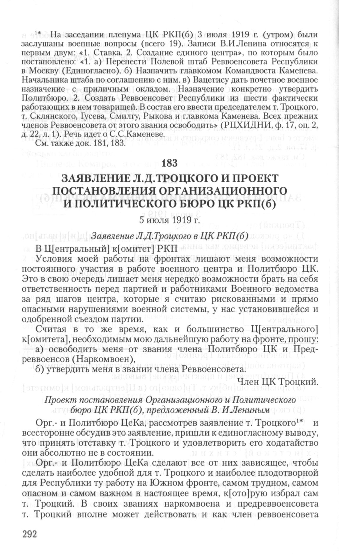 - a. ↑ Протокол совместного заседания Полит- и Оргбюро отсутствует. Имеется только протокол заседания Оргбюро ЦК РКП(б) за 5 июля 1919 г., но в нем записи о рассмотрении заявления Л.Д.Троцкого нет. См. также док. 181, 182.